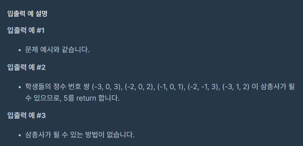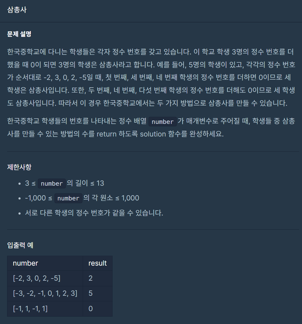 - 만약 세 값을 더했을 때 그 합이 0이면 삼총사이다. if (number[i] + number[j] + number[k] == 0): answer += 1