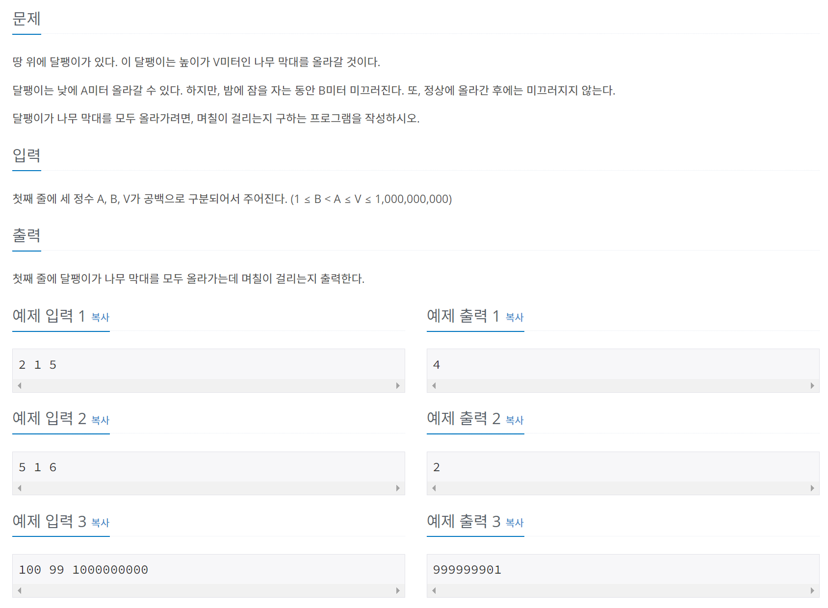첫째 줄에 세 정수 A, B, V가 공백으로 구분되어서 주어진다. (1 ≤ B < A ≤ V ≤ 1,000,000,000)