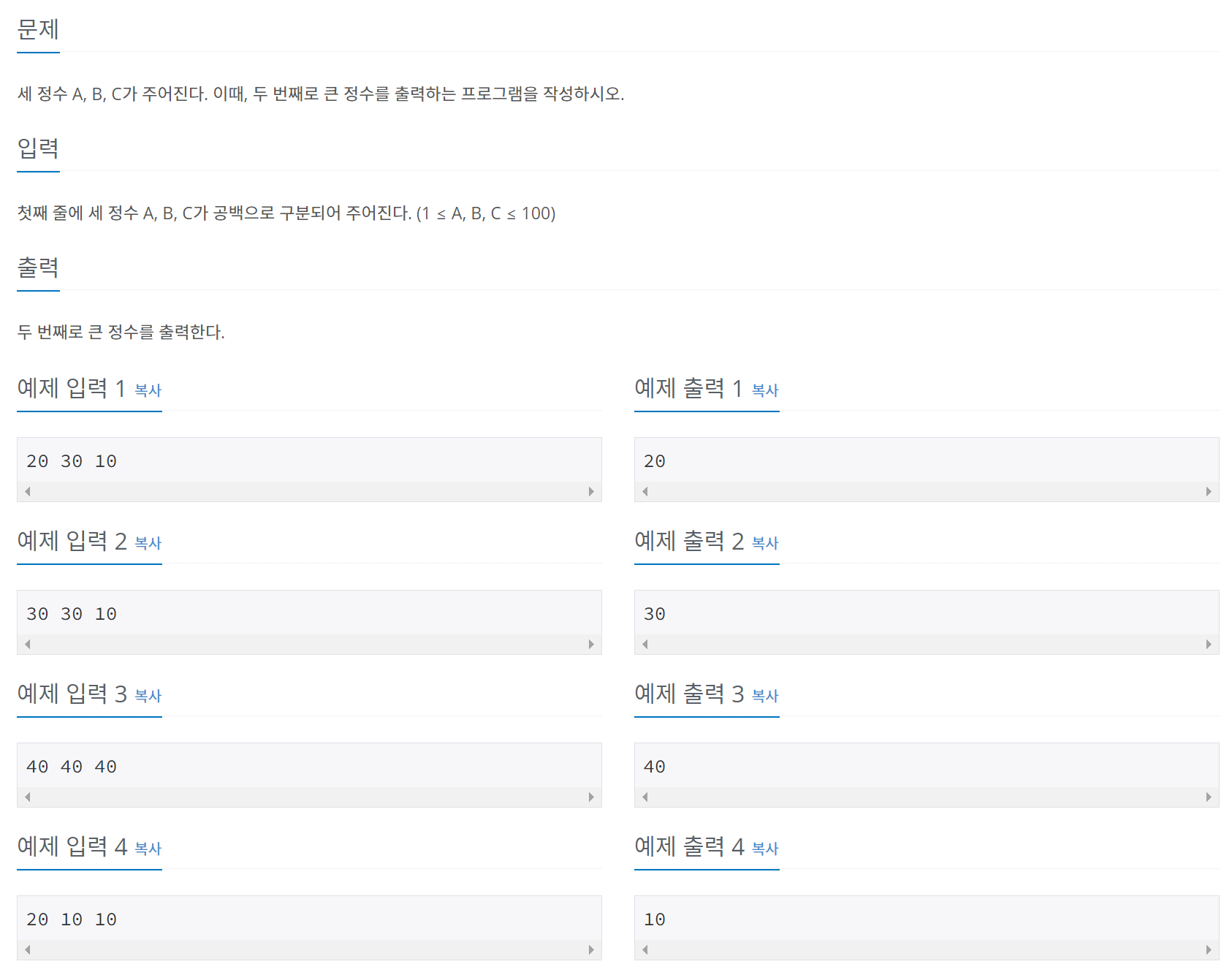 - 정렬한 수에서 두 번째로 큰 수인 가운데 수를 출력한다. print(li[1])