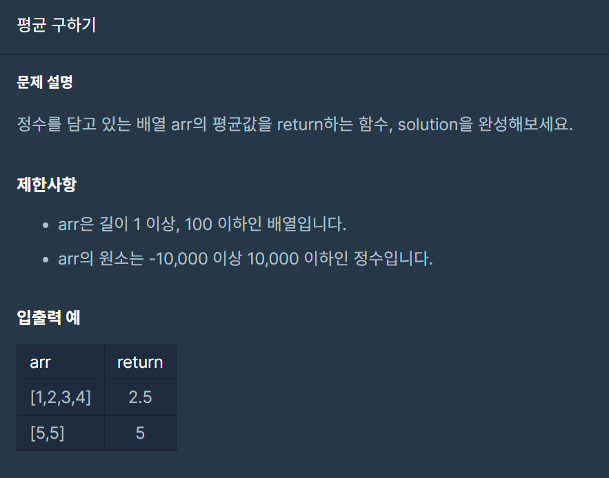 - 배열의 원소를 모두 더한 값을 배열의 원소 개수로 나눠준다. answer /= len(arr)