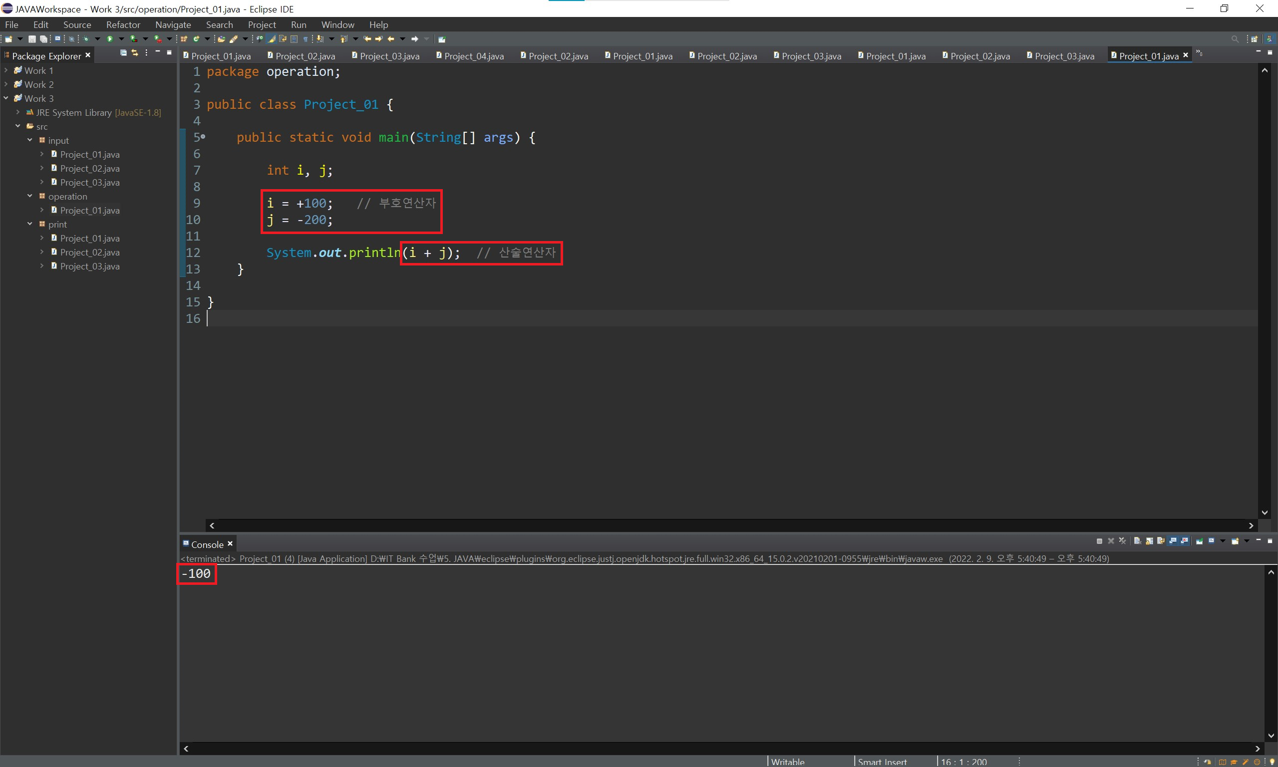 먼저 부호연산자는 값의 부호를 변환해 주는 연산자로 +, -가 있습니다.