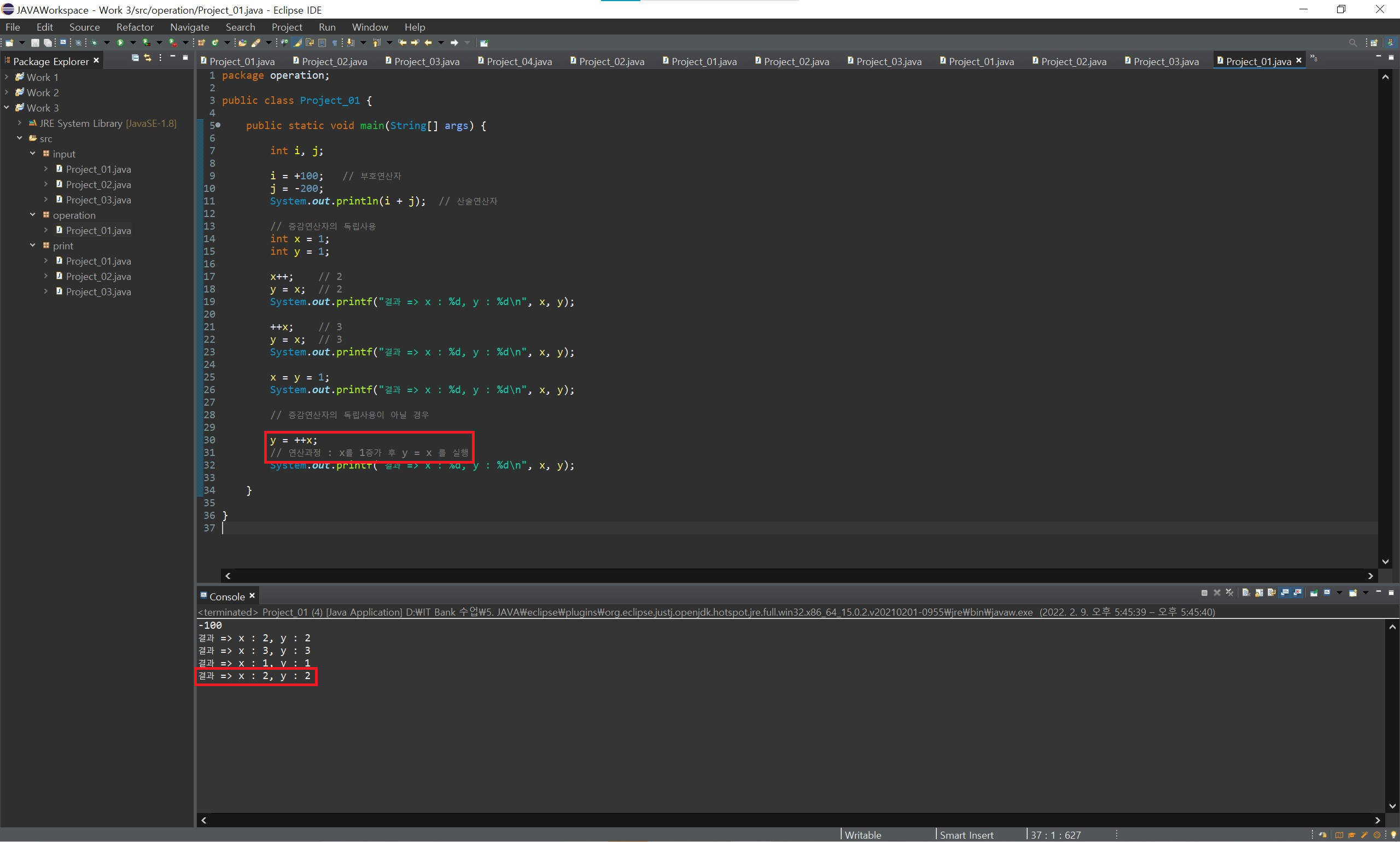 전위 증감연산자는 변수 앞에 연산자를 적어주어 변수의 값을 증가 및 감소시켜 준 뒤, 해당 값을 사용하지만 후위 증감연산자는 변수 뒤에 연산자를 적어주어 변수의 값을 먼저 사용하고 해당 값을 증가 및 감소시켜 줍니다.