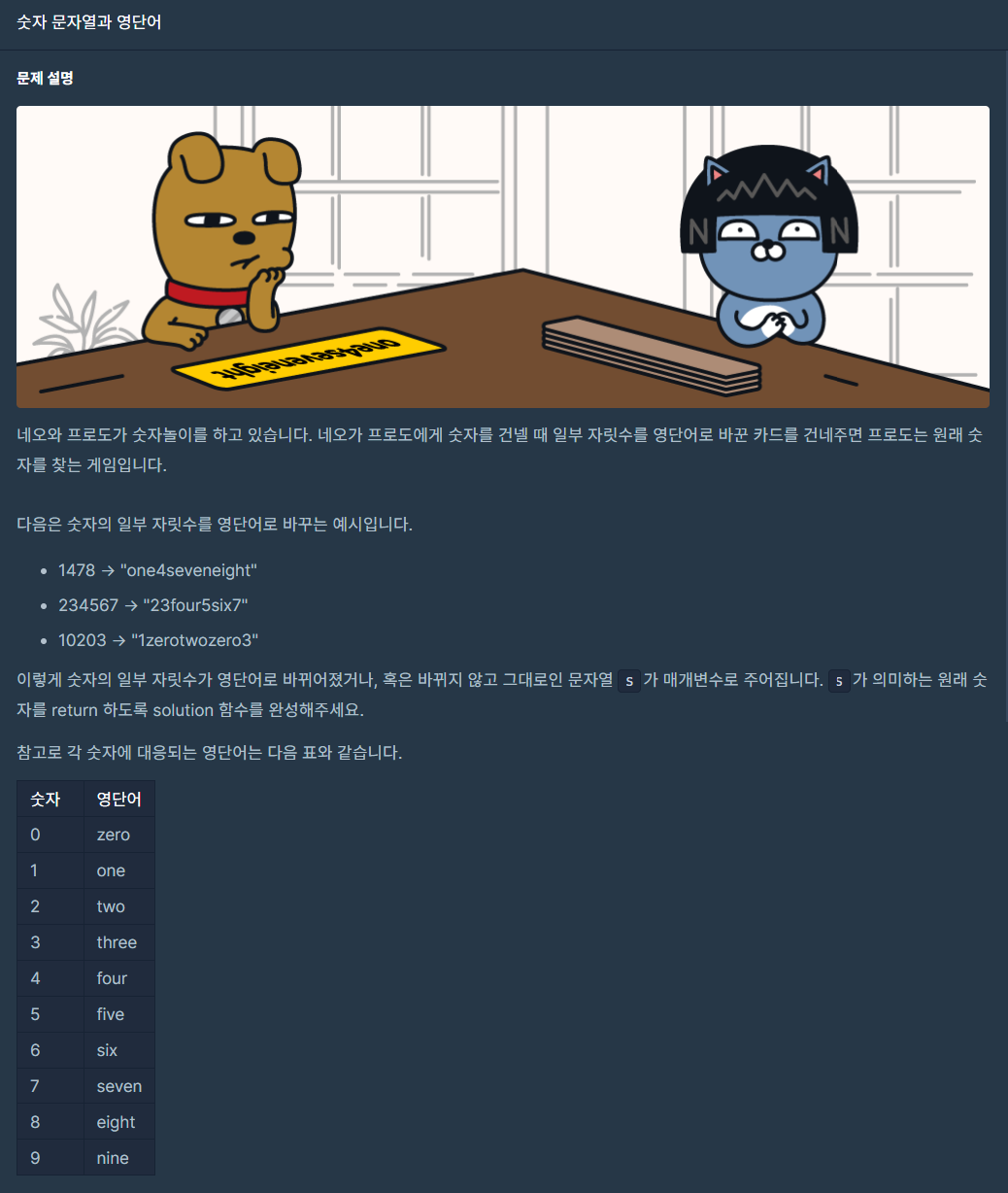 - 해당 영단어를 문자열 형태의 인덱스 값으로 바꿔준다. s = s.replace(i, str(words.index(i)))