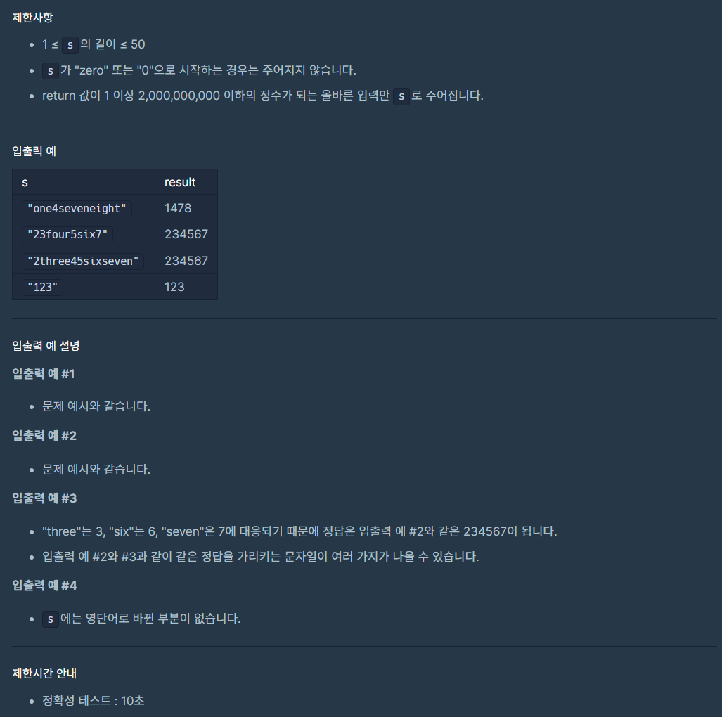 - 해당 영단어를 문자열 형태의 인덱스 값으로 바꿔준다. s = s.replace(i, str(words.index(i)))