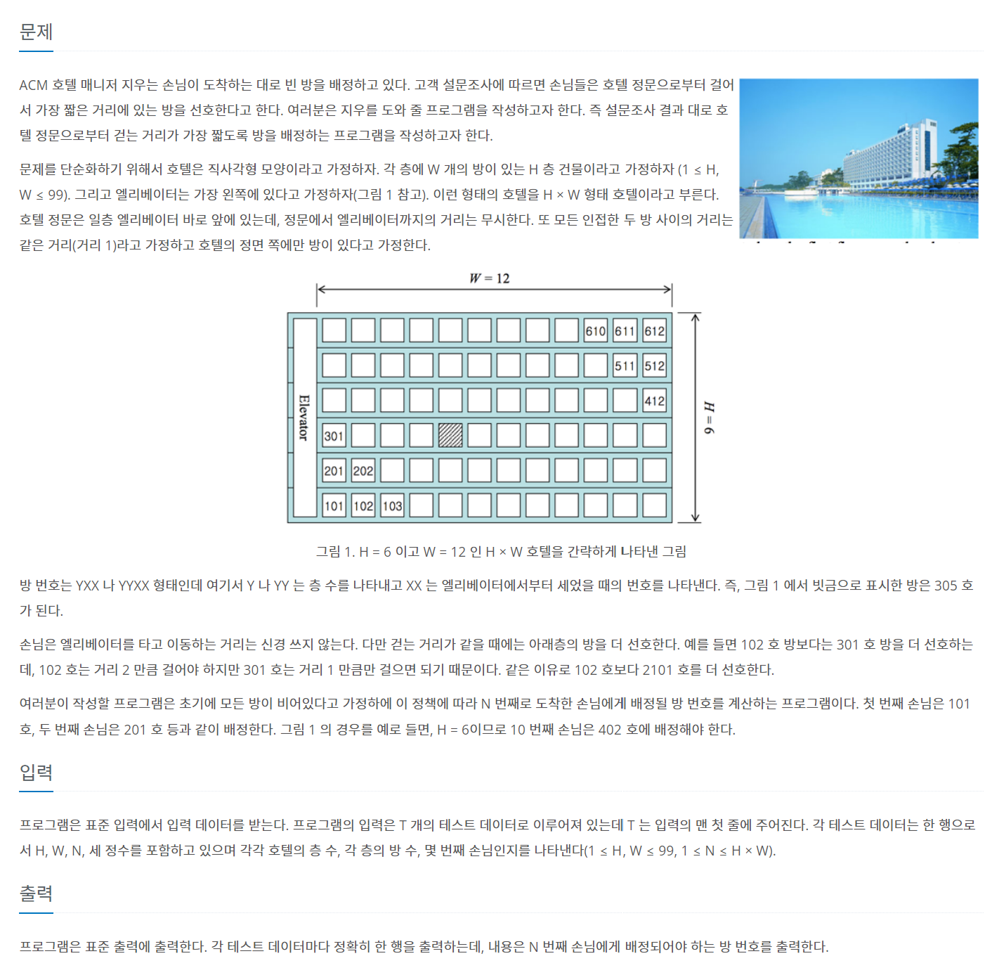 - 반면에 손님의 번호가 호텔의 층수와 비례하지 않는다면 손님의 방은 층수로 나눈 나머지 층에 위치할 것이며, 손님의 방 번호는 호텔 층수로 나눈 몫이 결과에 1을 더해준 값이 될 것이다. else: roon_num = (N % H * 100) + (N // H + 1)