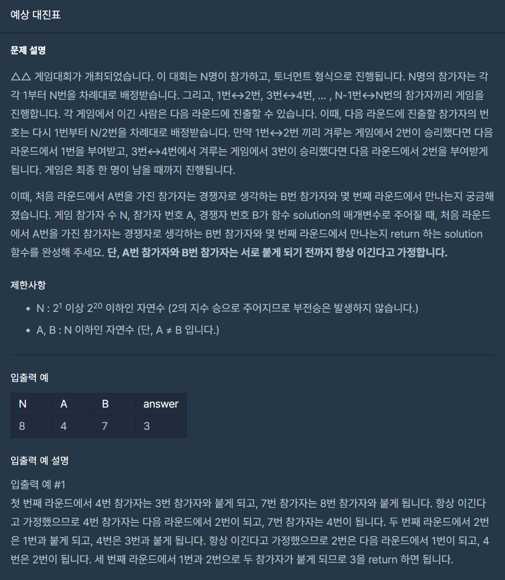 - 만약 두 참가자가 서로 다른 부분에 있다면 각 참가자는 모두 이기고 마지막에 서로 만나게 되므로 전체 참가자가 몇 라운드를 하게 되는지 구해주면 됩니다. else