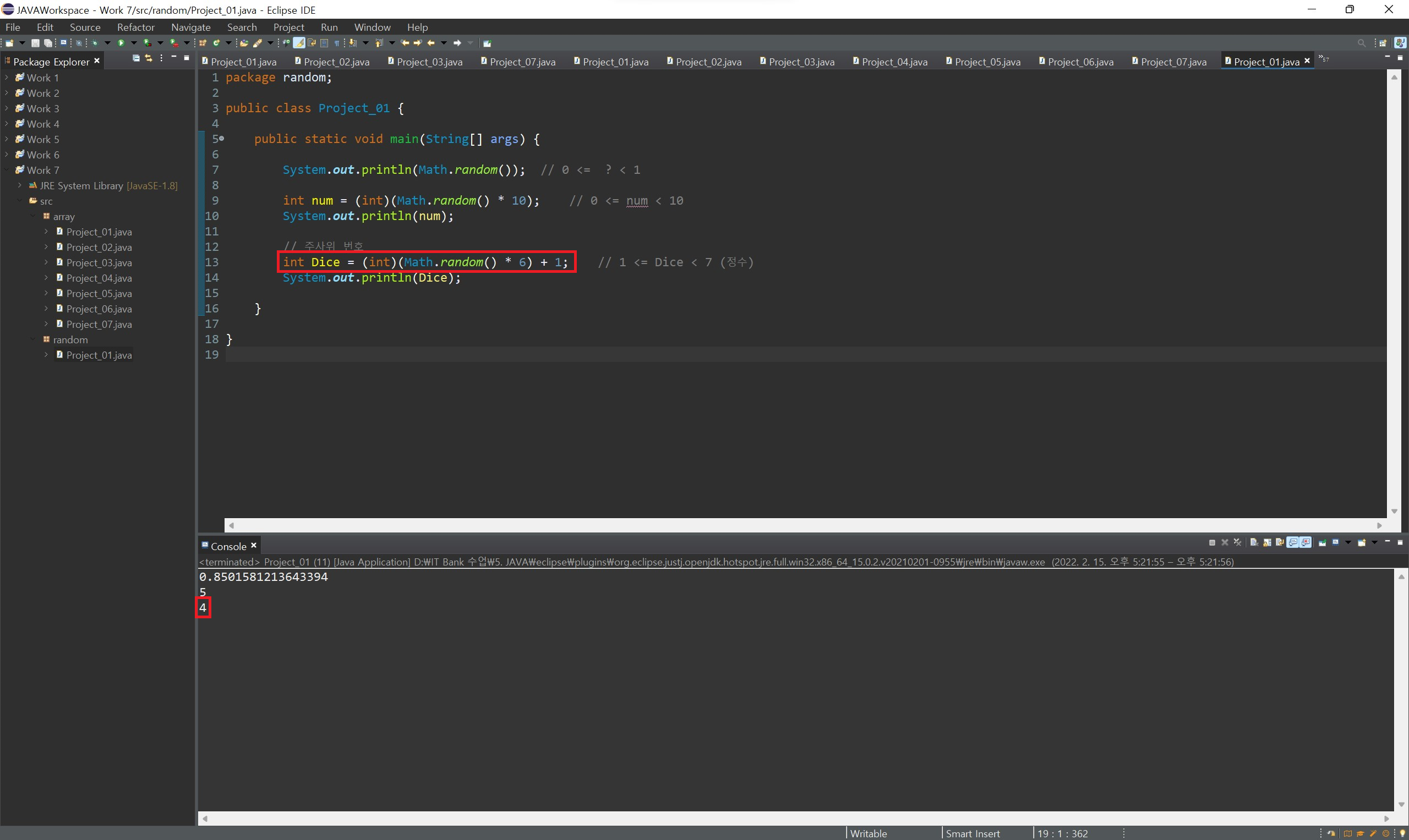 임의의 정수를 반환하는 방법에 대해 간단히 살펴보고 가겠습니다. 임의의 정수를 가져오는 방법은 Math.random() 메서드를 활용하면 됩니다. 해당 메서드는 0 이상 1 미만의 수를 double 타입으로 생성하는데 해당 메서드에 값을 곱하고 정수 타입을 변환하면 0부터 곱한 값 이전까지의 정수의 값을 반환하게 됩니다.