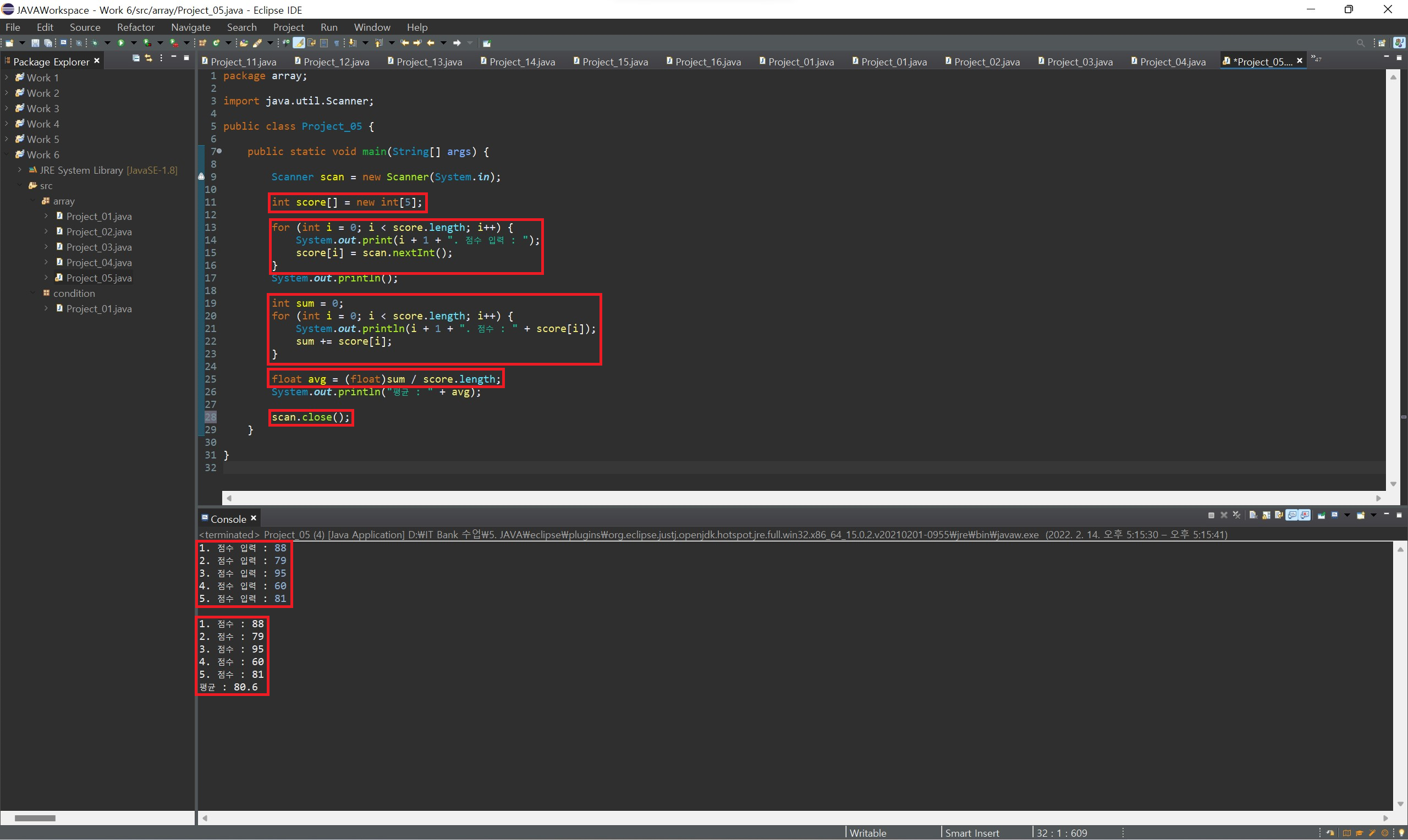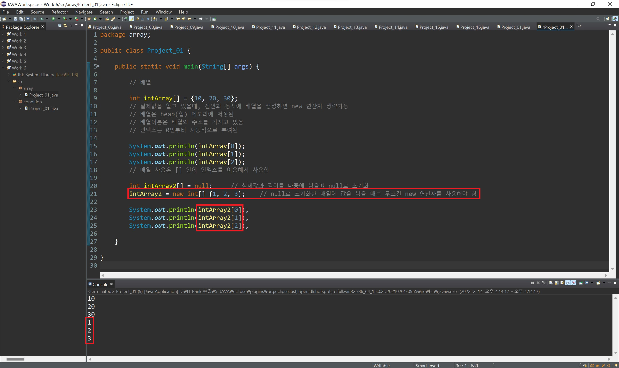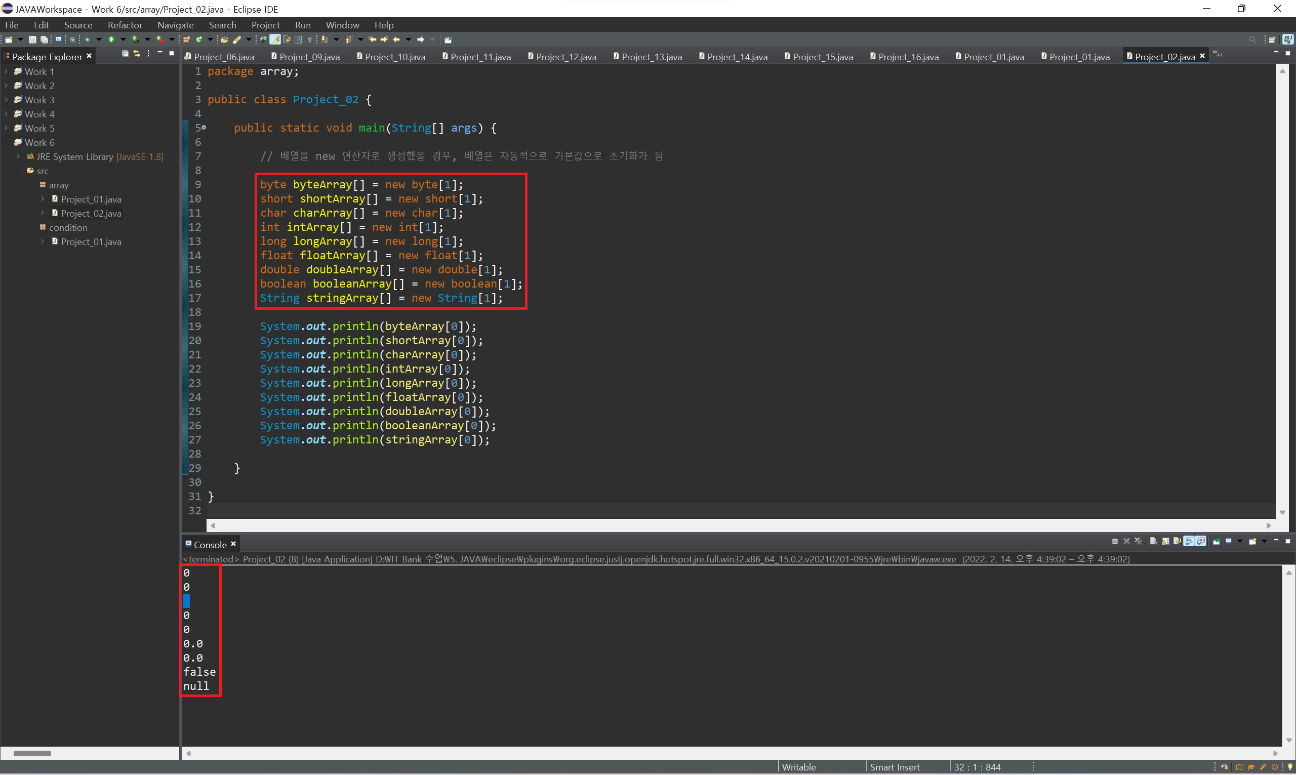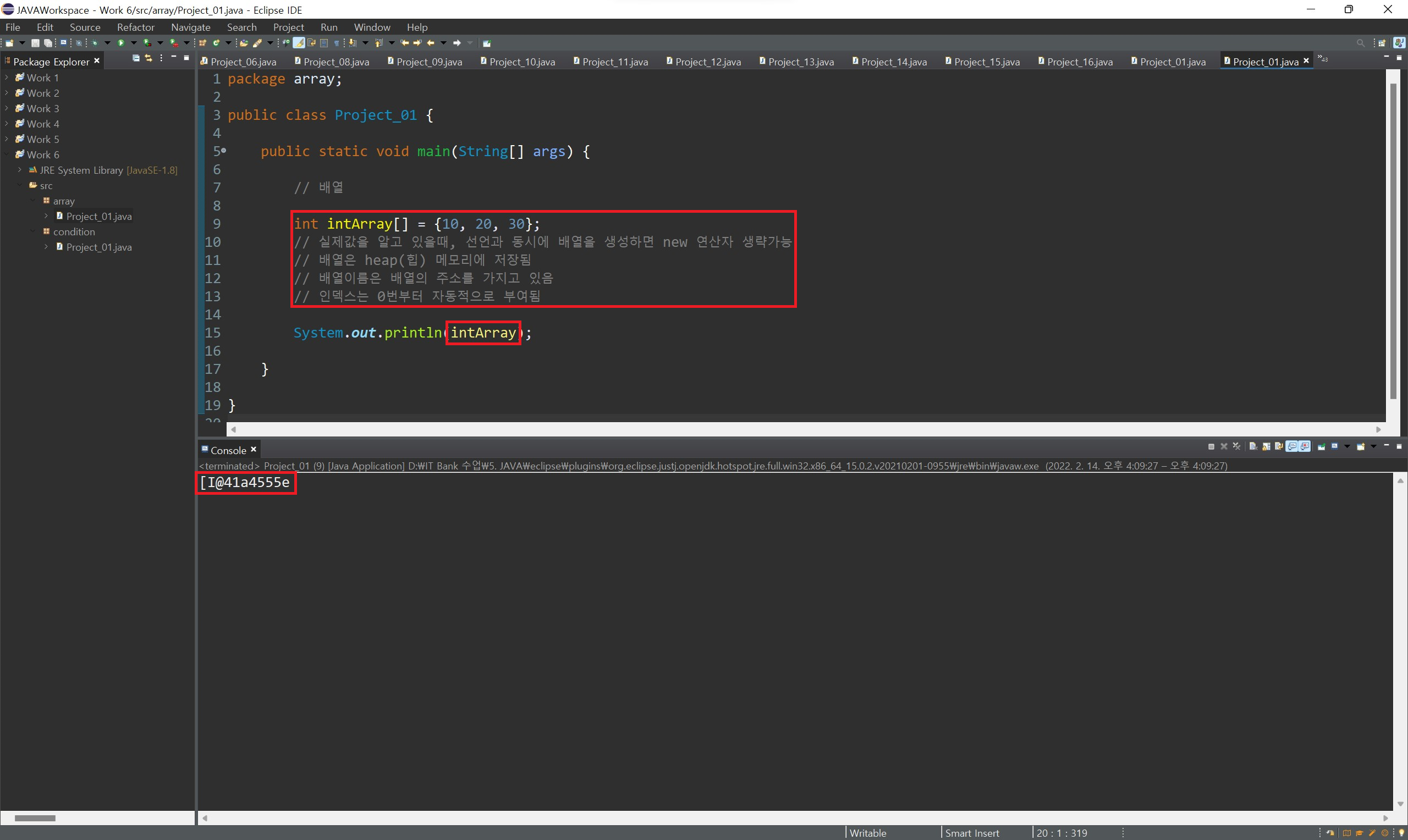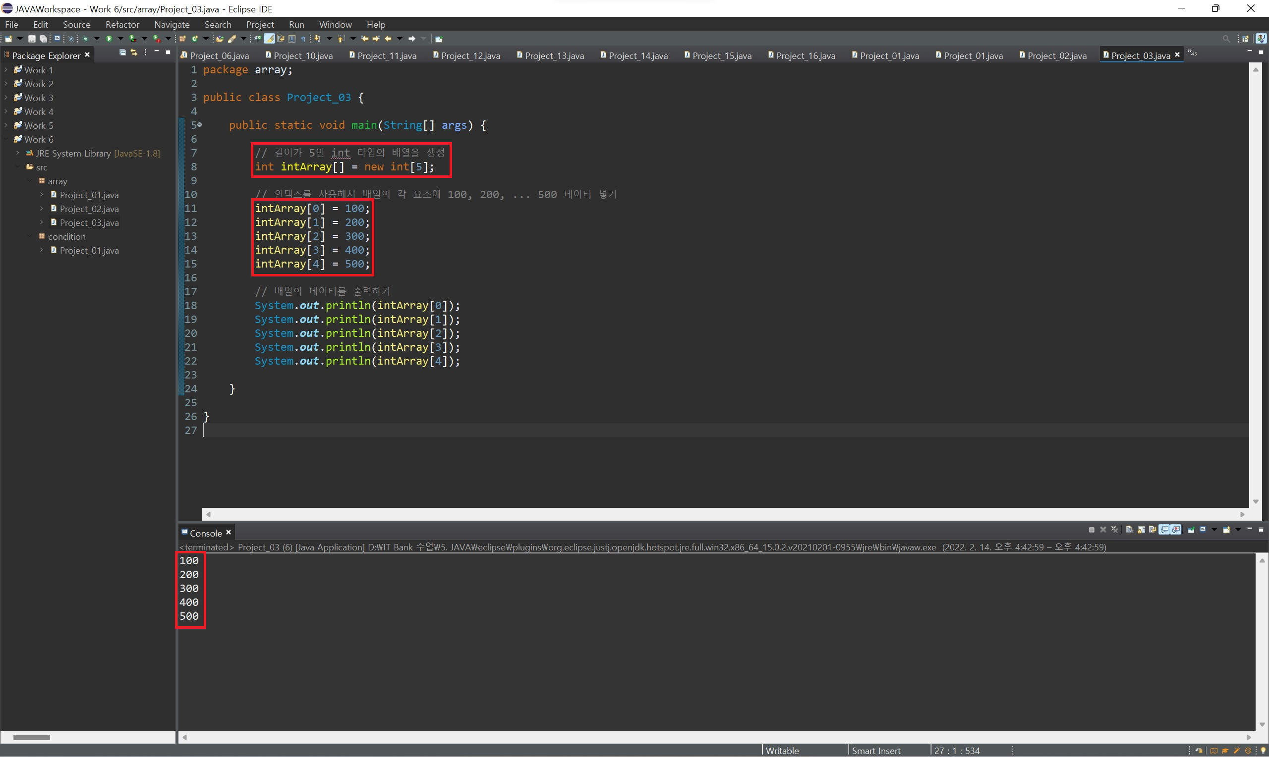 또한 배열 변수를 생성할 때 지정한 자료형과 배열을 생성할 때 지정한 자료형이 동일하다는 것도 볼 수 있습니다.