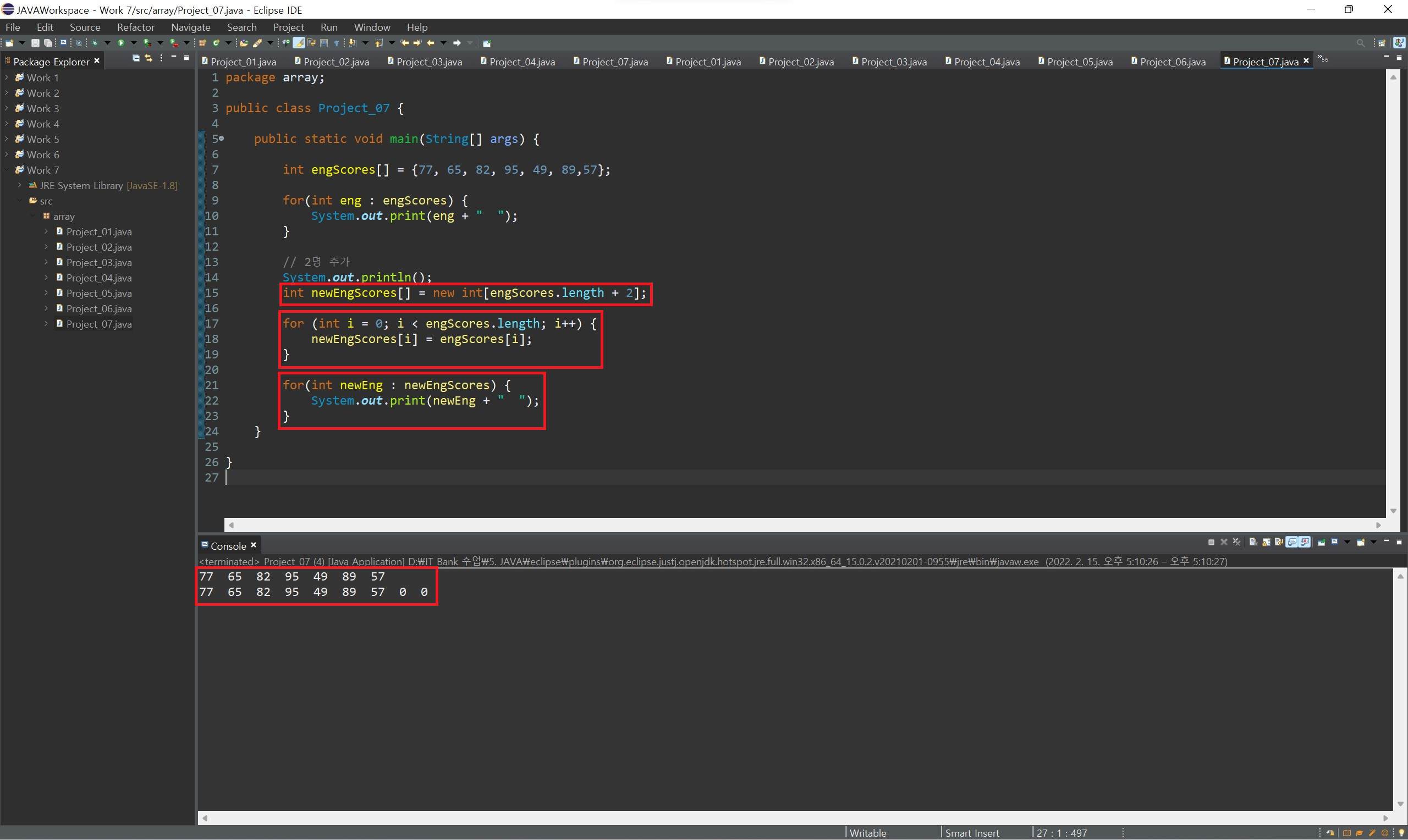 값의 목록을 가지고 있지는 않지만, 나중에 값들을 저장할 배열을 미리 만들어 둘 때는 new 연산자로 배열을 생성하면 됩니다. 자료형[] 변수명 = new 자료형[배열의 길이]; 형식으로 작성해 길이가 정해진 배열을 생성해 주고 나중에 변수명[index] = 값 형식으로 값을 지정해 줄 수 있습니다.