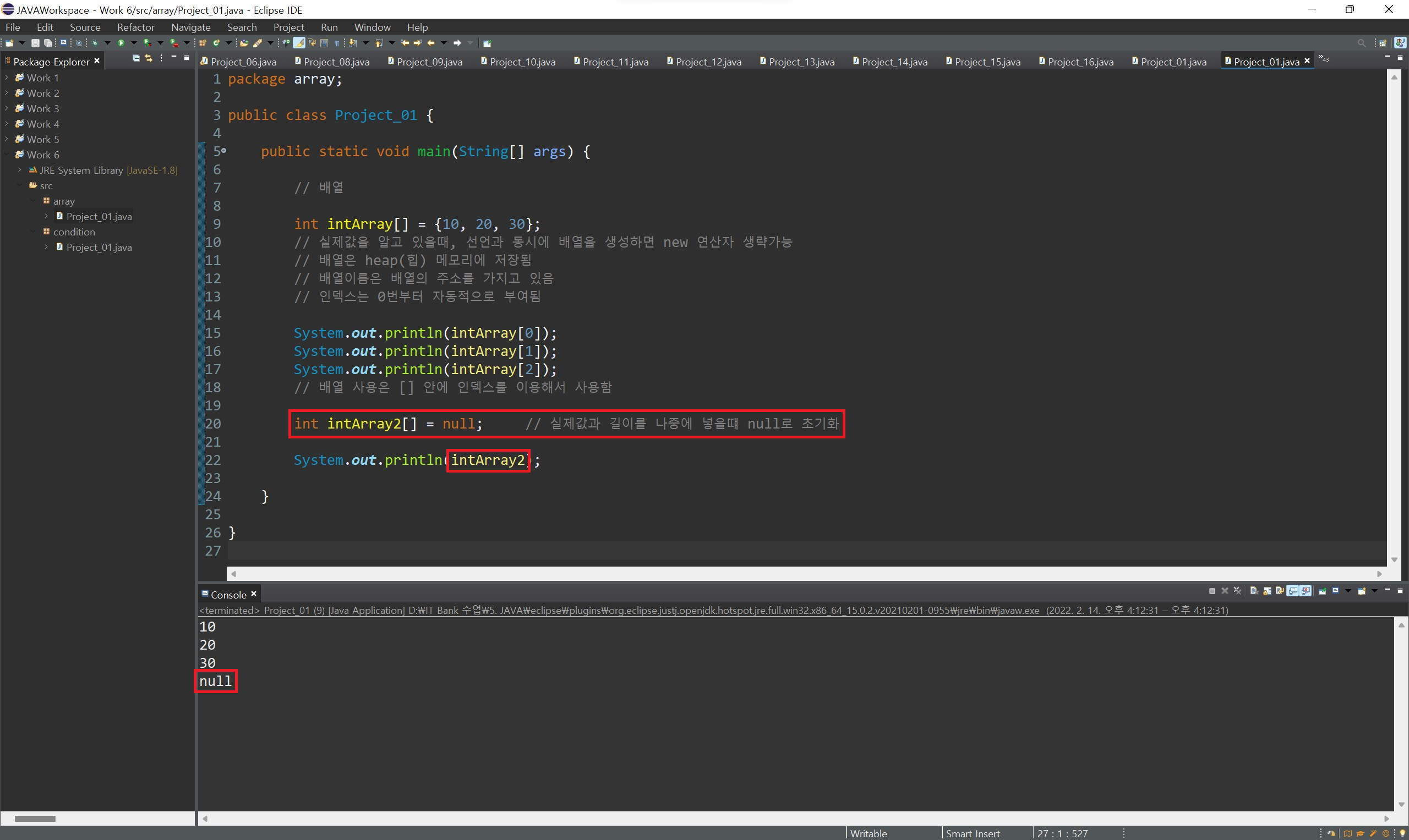 배열 변수는 힙 영역의 배열 실제 값을 참조하게 되는데, 만약 참조할 배열의 실제 값이 없다면 배열 변수는 배열 변수는 null 값으로 초기화해 줄 수 있습니다.