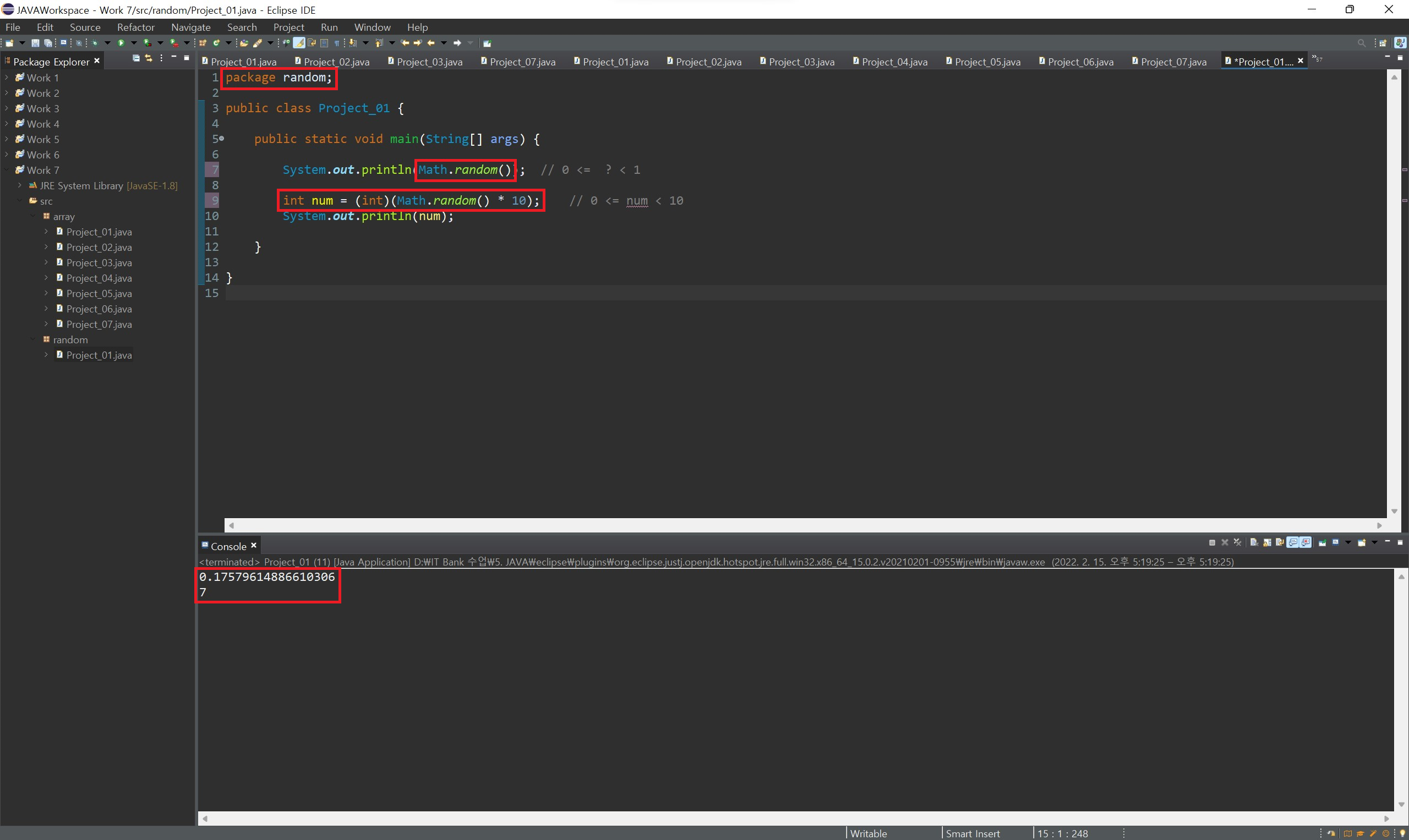 임의의 정수를 반환하는 방법에 대해 간단히 살펴보고 가겠습니다. 임의의 정수를 가져오는 방법은 Math.random() 메서드를 활용하면 됩니다. 해당 메서드는 0 이상 1 미만의 수를 double 타입으로 생성하는데 해당 메서드에 값을 곱하고 정수 타입을 변환하면 0부터 곱한 값 이전까지의 정수의 값을 반환하게 됩니다.