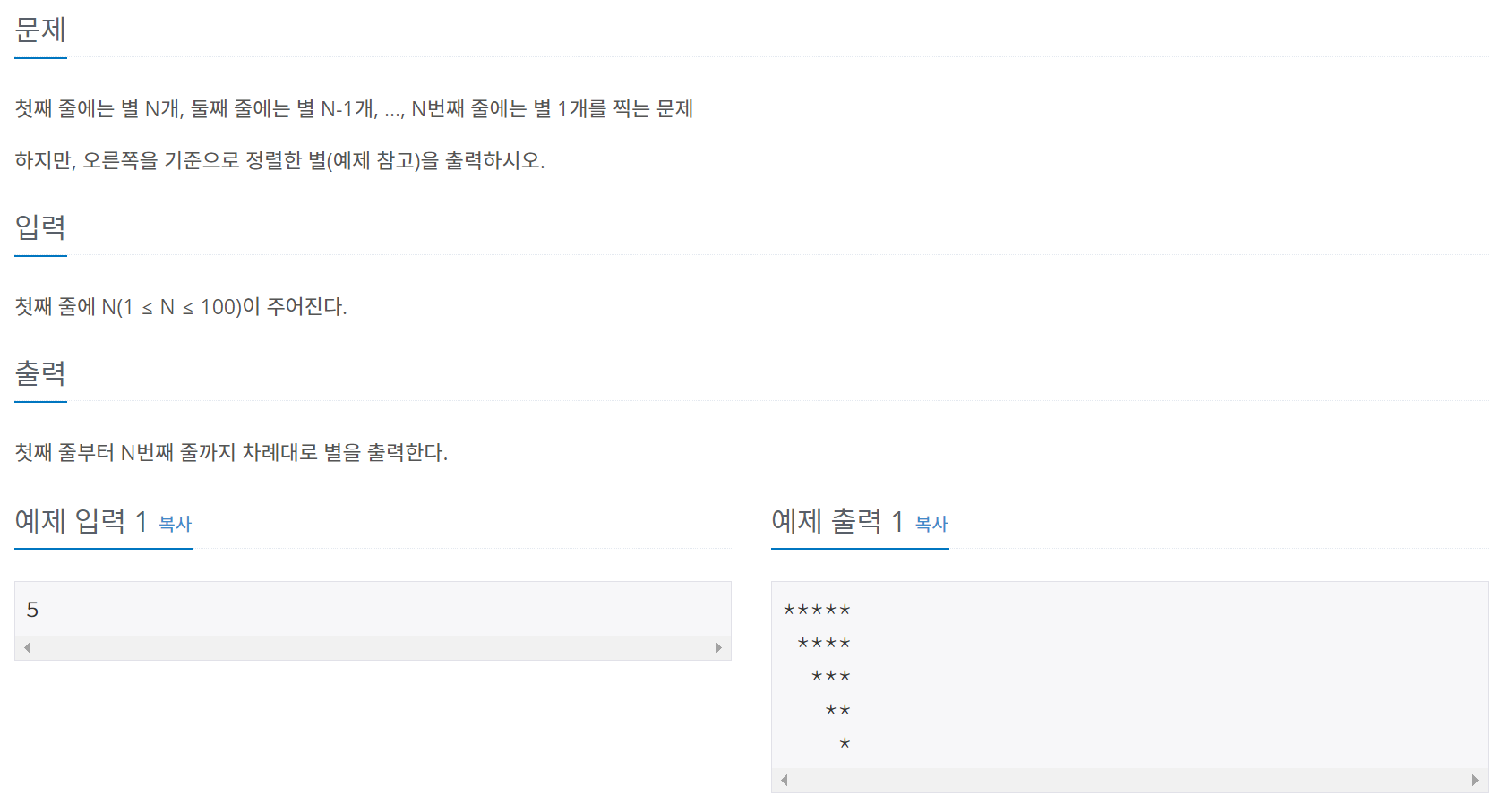 첫째 줄에는 별 N개, 둘째 줄에는 별 N-1개, ..., N번째 줄에는 별 1개를 찍는 문제 하지만, 오른쪽을 기준으로 정렬한 별(예제 참고)을 출력하시오.