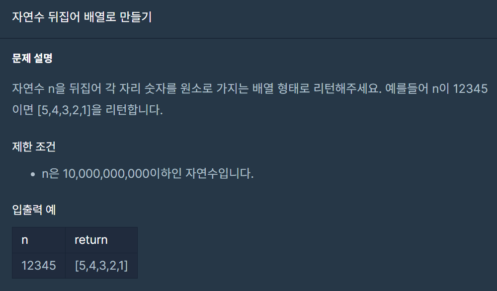 - 매개변수로 받은 n의 자연수를 뒤집어 배열로 만들어야 하기 때문에 리턴할 정답 배열에 n의 1의 자릿수를 추가한다. answer.append(n % 10)