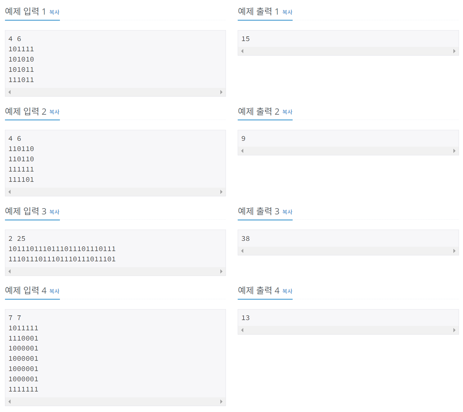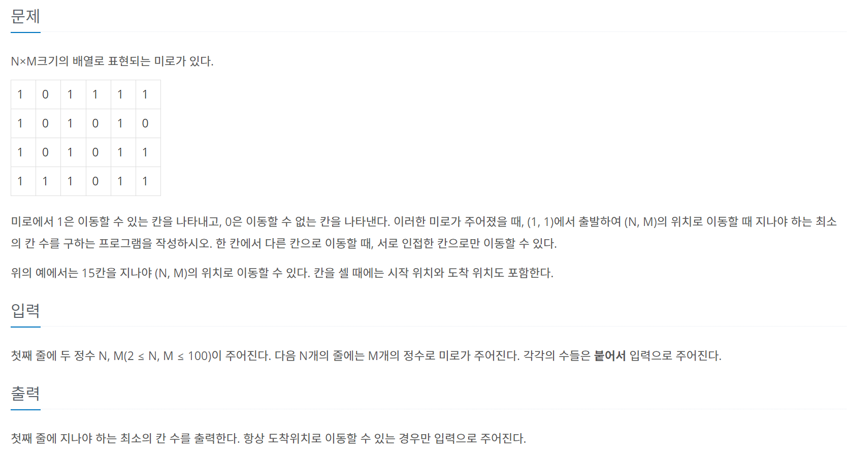 첫째 줄에 두 정수 N, M(2 ≤ N, M ≤ 100)이 주어진다. 다음 N개의 줄에는 M개의 정수로 미로가 주어진다. 각각의 수들은 붙어서 입력으로 주어진다.