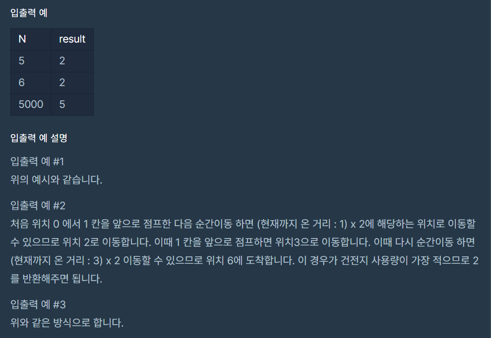 해당 문제를 풀 때 어떻게 하면 건전지를 최소로 사용할 수 있을지 생각하면서 순간 이동을 많이 사용해야겠다는 생각을 했다. 1부터 각 경우마다 최소 건전지 사용 횟수를 계산해 보다가 6에서 입출력 예 설명을 보니 6은 1로 점프 후, 2로 순간 이동, 다시 3으로 점프, 6으로 순간 이동한 결과를 확인하게 되었다. 하여 무조건 먼저 순간 이동으로 최대로 이동을 하면 안 되겠다는 생각이 들었다.