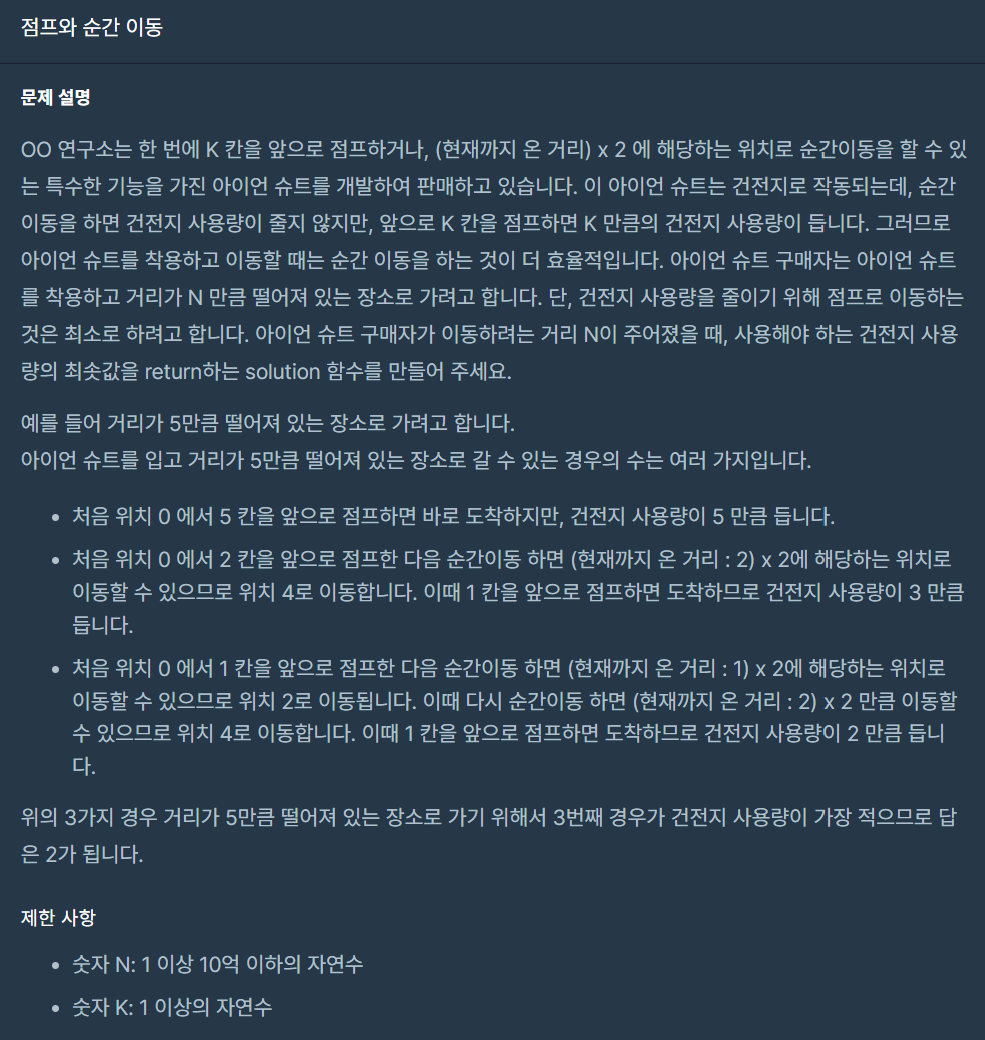 이후, 2로 계속 나눠보기도 하고 3으로 나눠보기도 하고 계속 고민을 하던 중 각 수를 2진수로 변환했을 때 해당 2진수의 1의 개수만큼 점프를 하면 된다는 규칙을 발견했다.