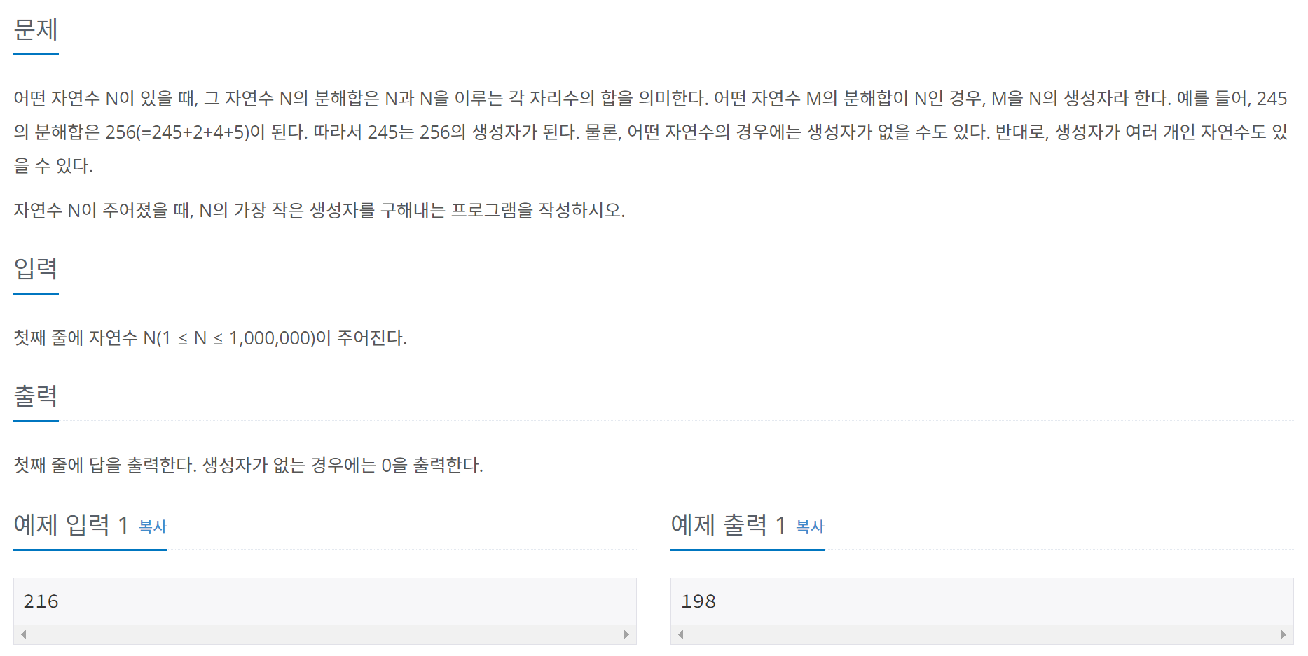 - 가장 작은 생성자를 구하는 문제이므로 가장 먼저 찾은 생성자의 값이 가장 작은 생성자이다. 따라서 가장 작은 생성자를 찾았으므로 종료한다. break