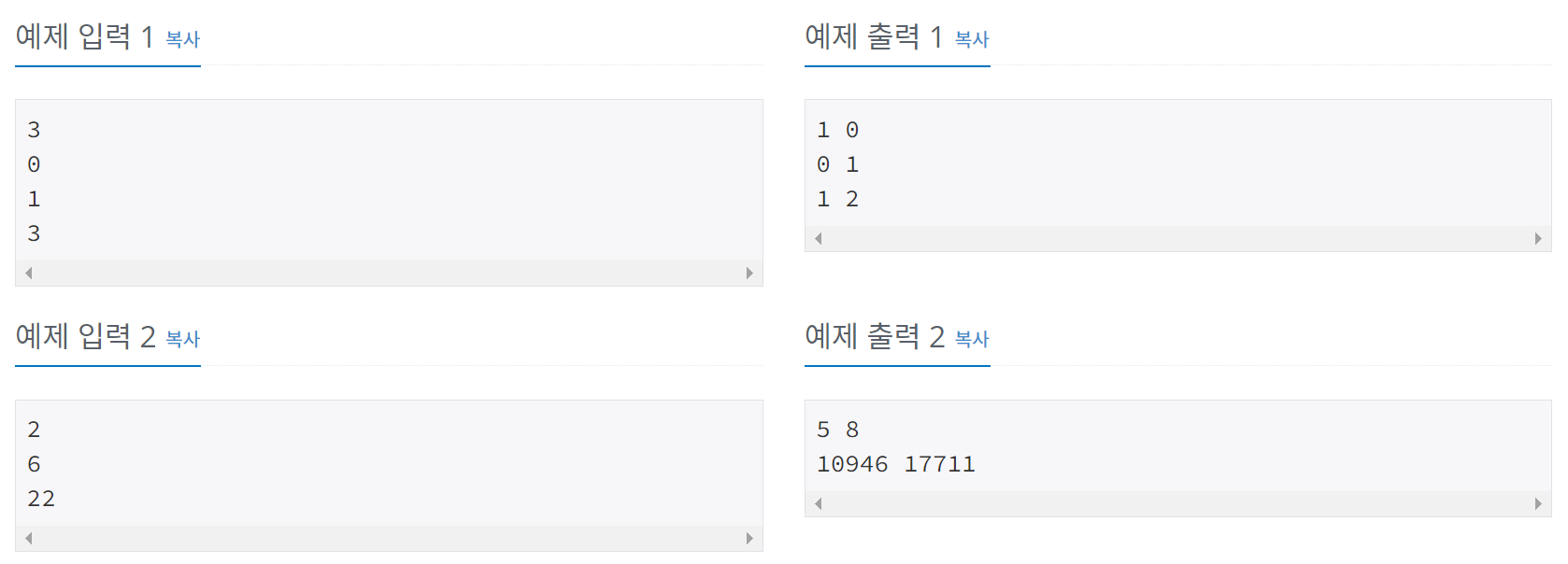 - 각 수의 0과 1의 개수를 추가한다. li.append([li[i - 2][0] + li[i - 1][0], li[i - 2][1] + li[i - 1][1]])
