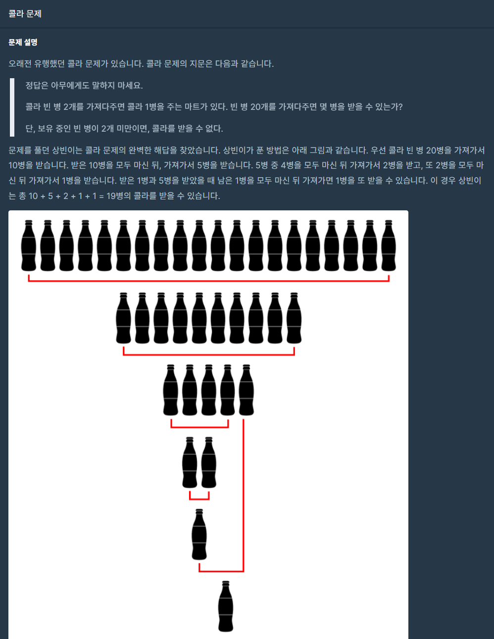 - 남아있는 콜라의 개수가 바꿀 수 있는 콜라의 개수보다 작아질 때까지 반복한다. while (n >= a)