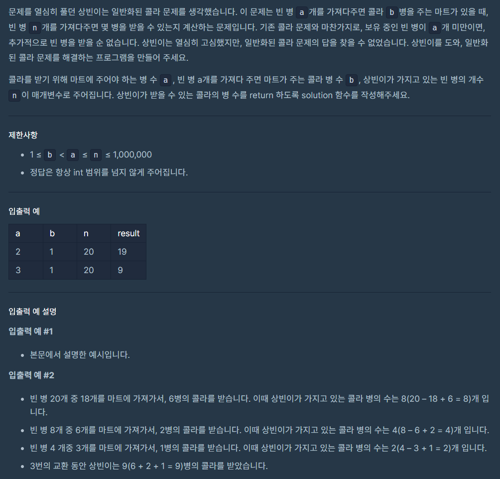 - 이후 바꾼 결과에 바꾸기 전 바꾸지 못하고 남은 콜라까지 더하여 그 값을 새로 저장한다. n = (n // a) * b + (n % a)