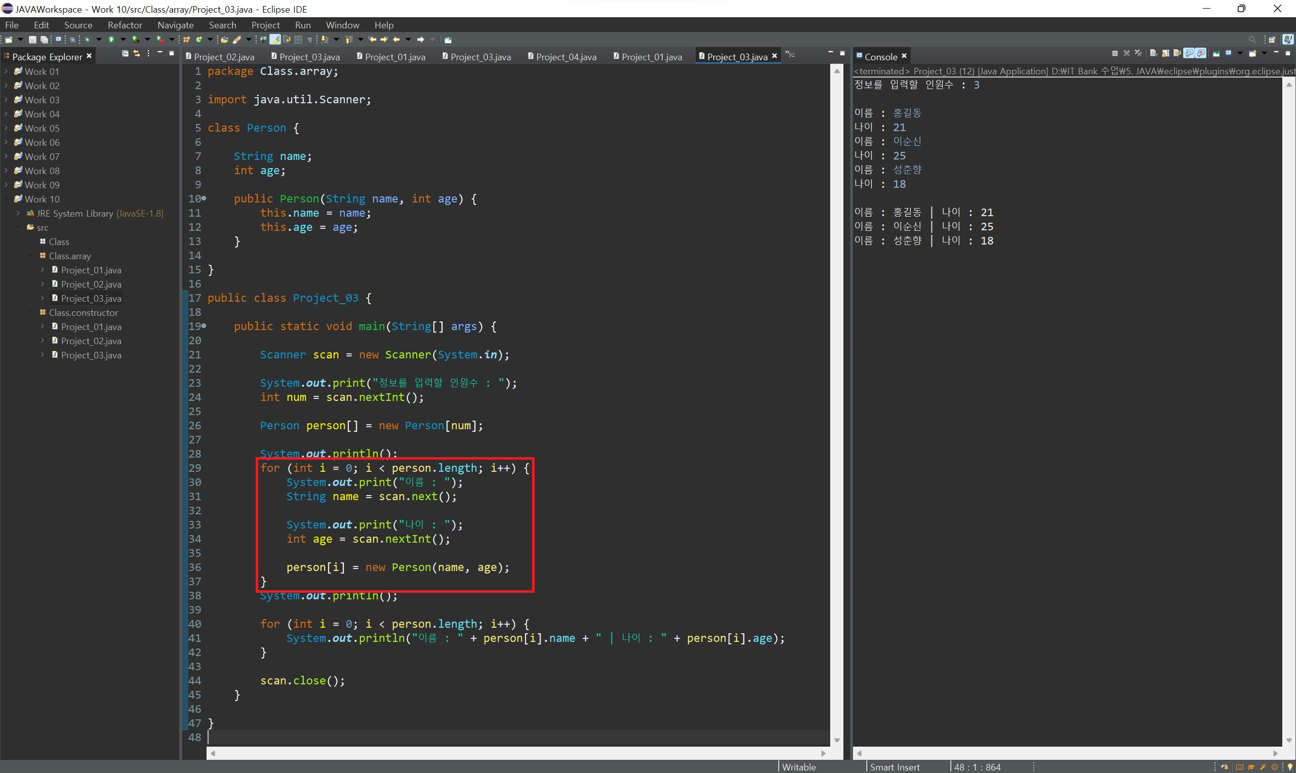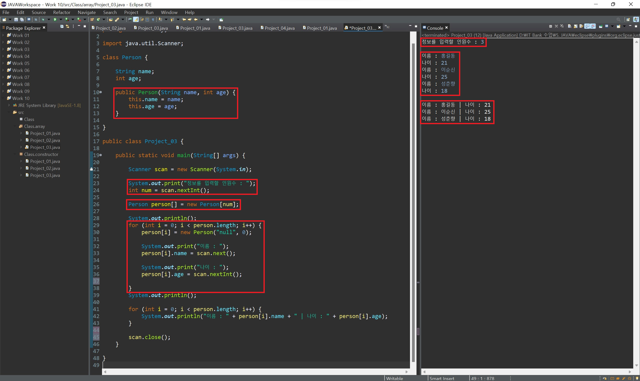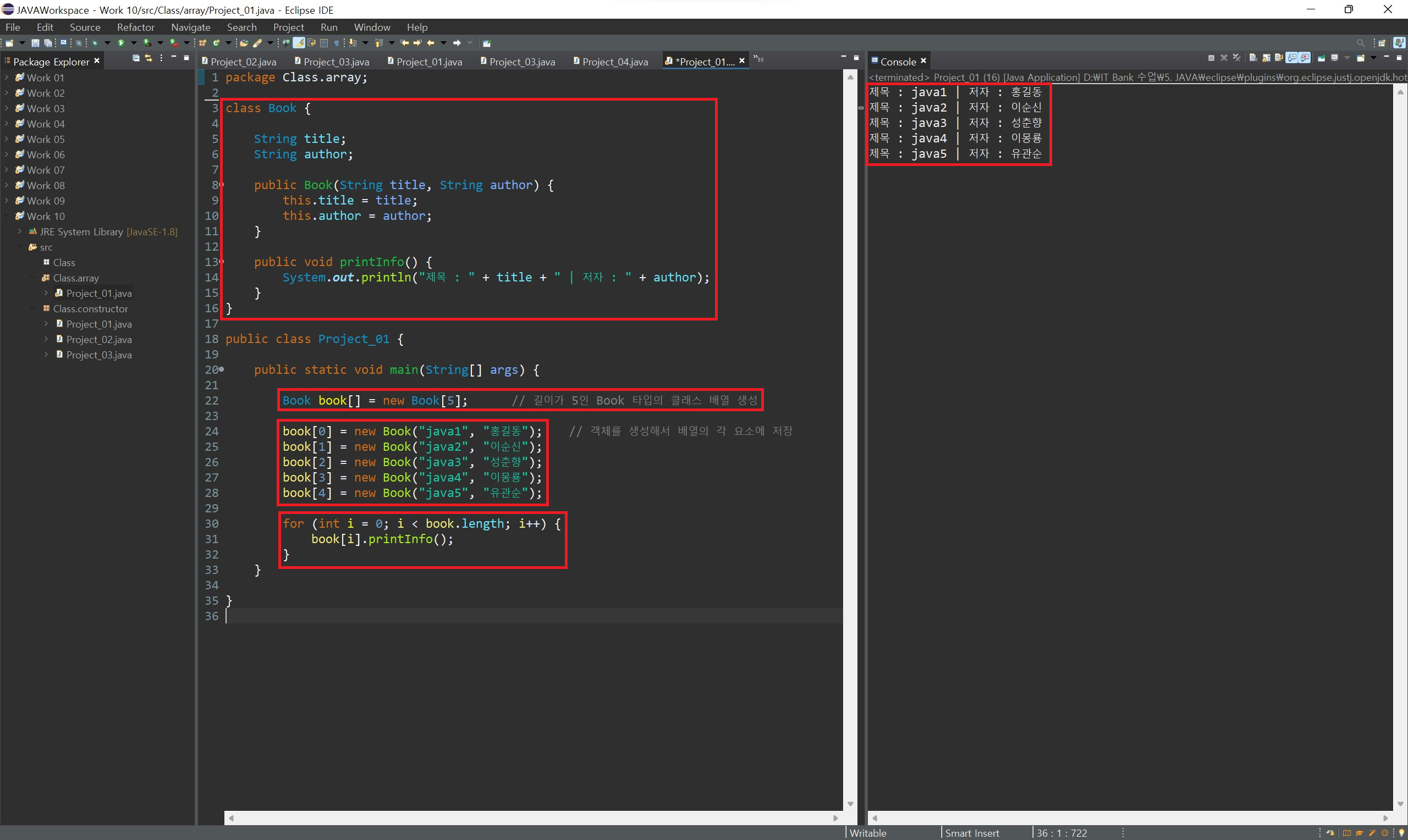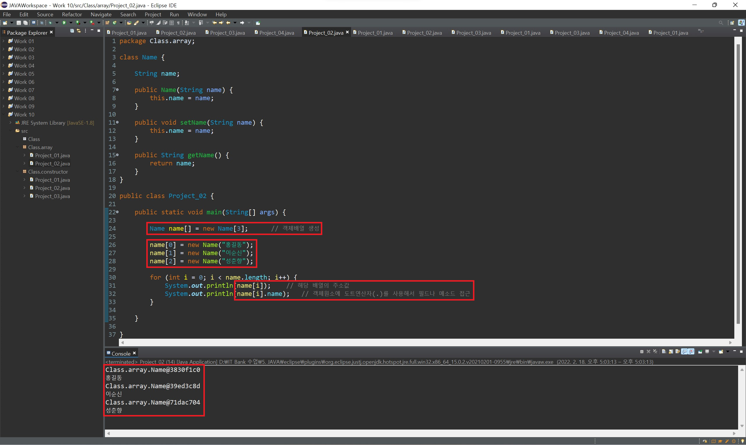 클래스 배열은 기본적으로 클래스를 만들고 클래스 이름[] 변수 이름 = new 클래스 이름[배열 길이]; 형식으로 선언할 수 있고 변수 이름[index 값] = new 생성자(매개변수,...); 형식으로 클래스 배열을 각각 생성할 수 있습니다.