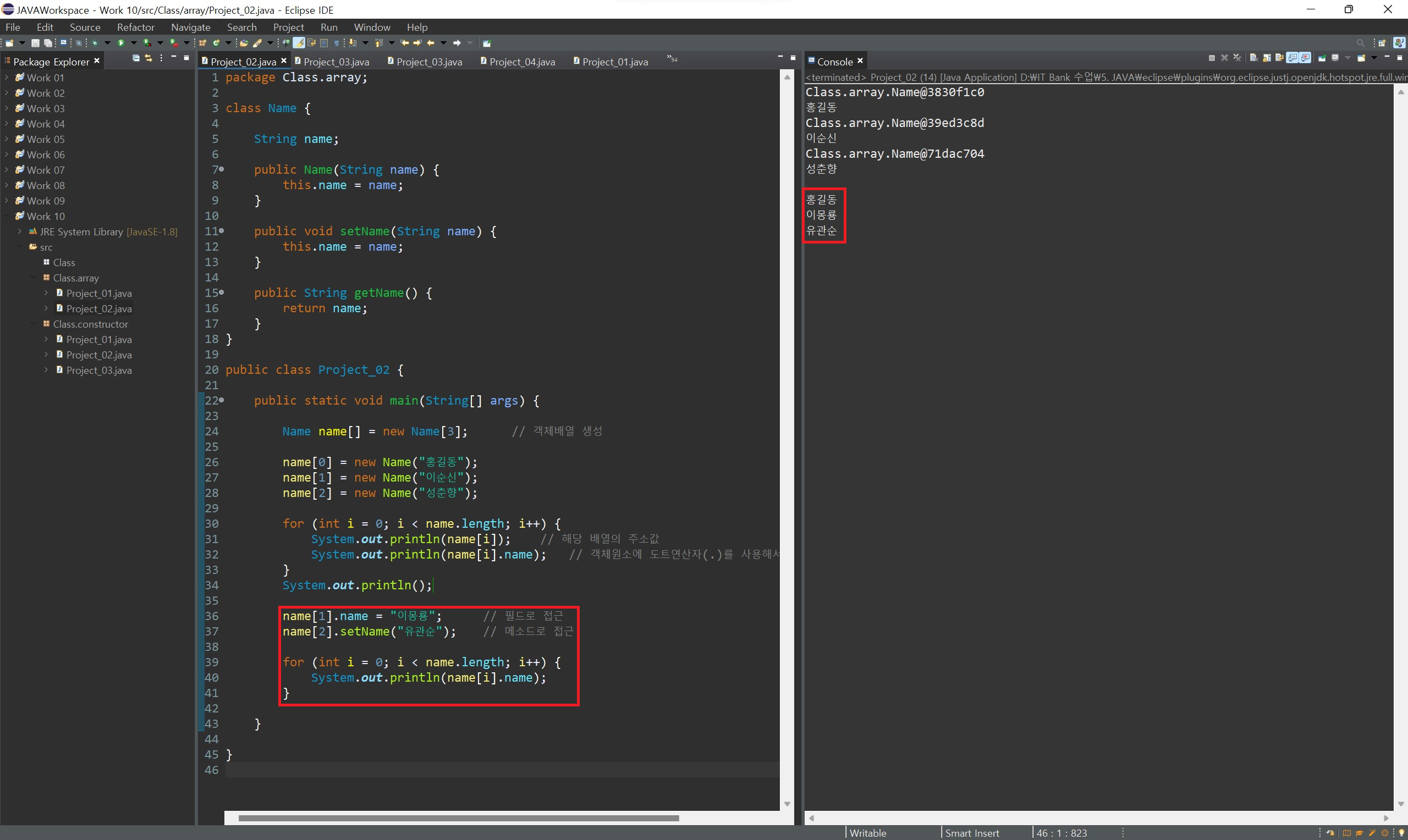 객체 배열은 기본 자료형 배열과 마찬가지로 index를 활용하여 각 원소에 접근할 수 있습니다.
