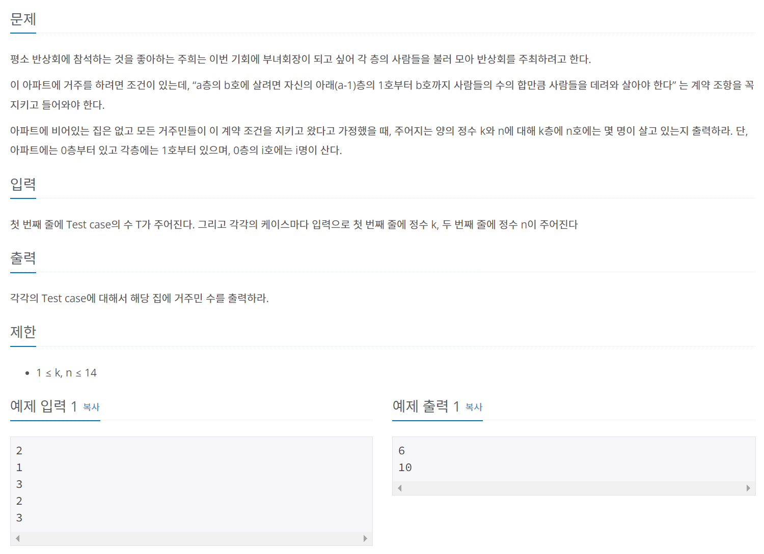 - 해당 층의 호 수에 거주하는 사람의 수를 구하여 추가한다. 사람의 수는 같은 층의 앞 호의 사람 수와 같은 호의 아래층 사람의 수를 더하면 된다. n_people[i].append(n_people[i - 1][j] + n_people[i][j - 1])