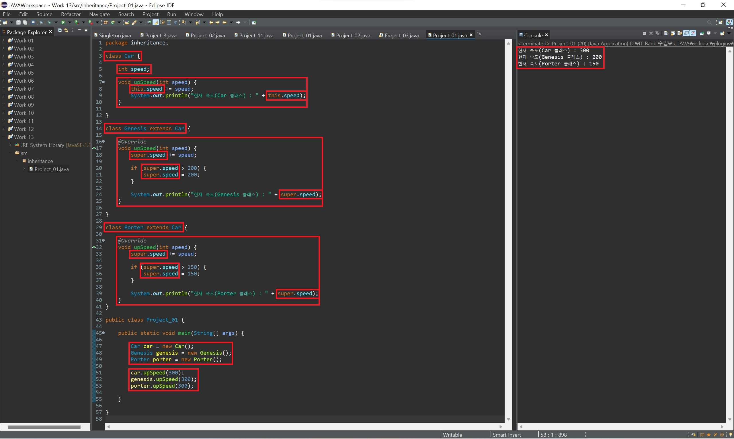 Java에서 상속할 때 여러 개의 부모 클래스를 상속할 수 없이 extends 뒤에는 단 하나의 부모 클래스만 와야 합니다.