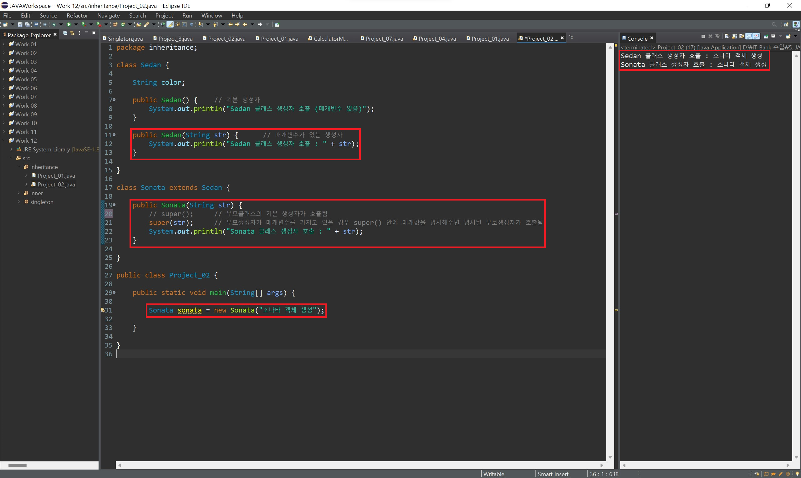 부모 생성자는 자식 생성자의 맨 첫 줄에서 호출되며, super();를 사용하여 부모의 기본 생성자를 호출합니다.