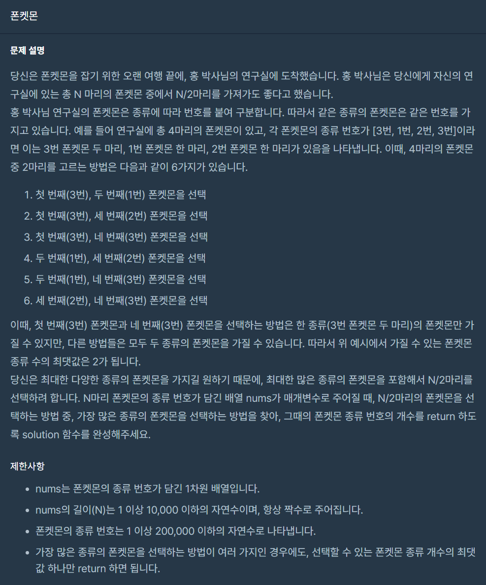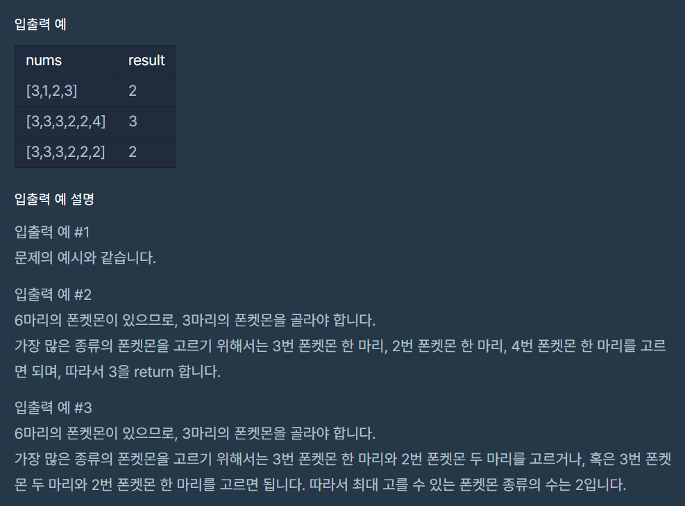 - 최대 고를 수 있는 폰켓몬 종류의 수는 가져갈 수 있는 폰켓몬 수와 같다. answer = len(nums) // 2