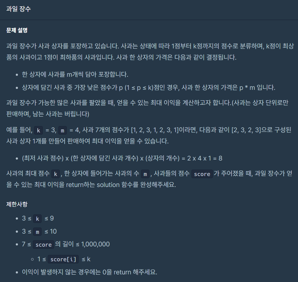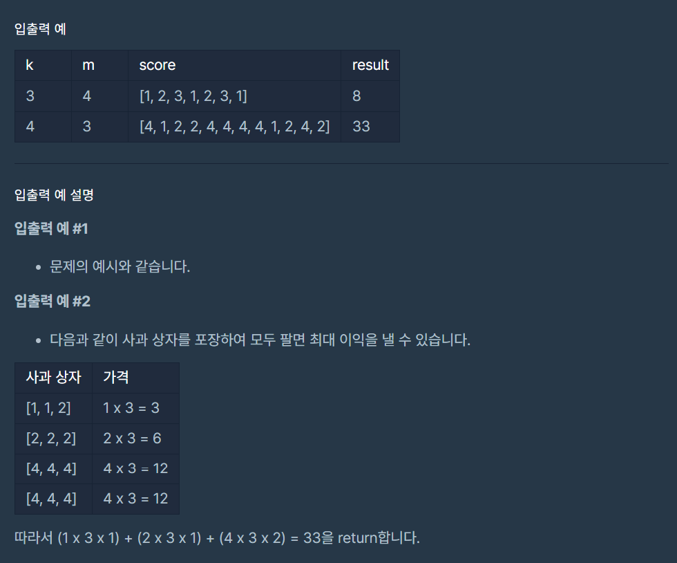 - 포장한 상자의 가격은 상자에 담긴 사과들 중 가장 낮은 가격에 사과 개수를 곱한 값이다. price = min(box) * len(box)