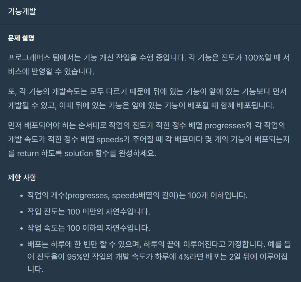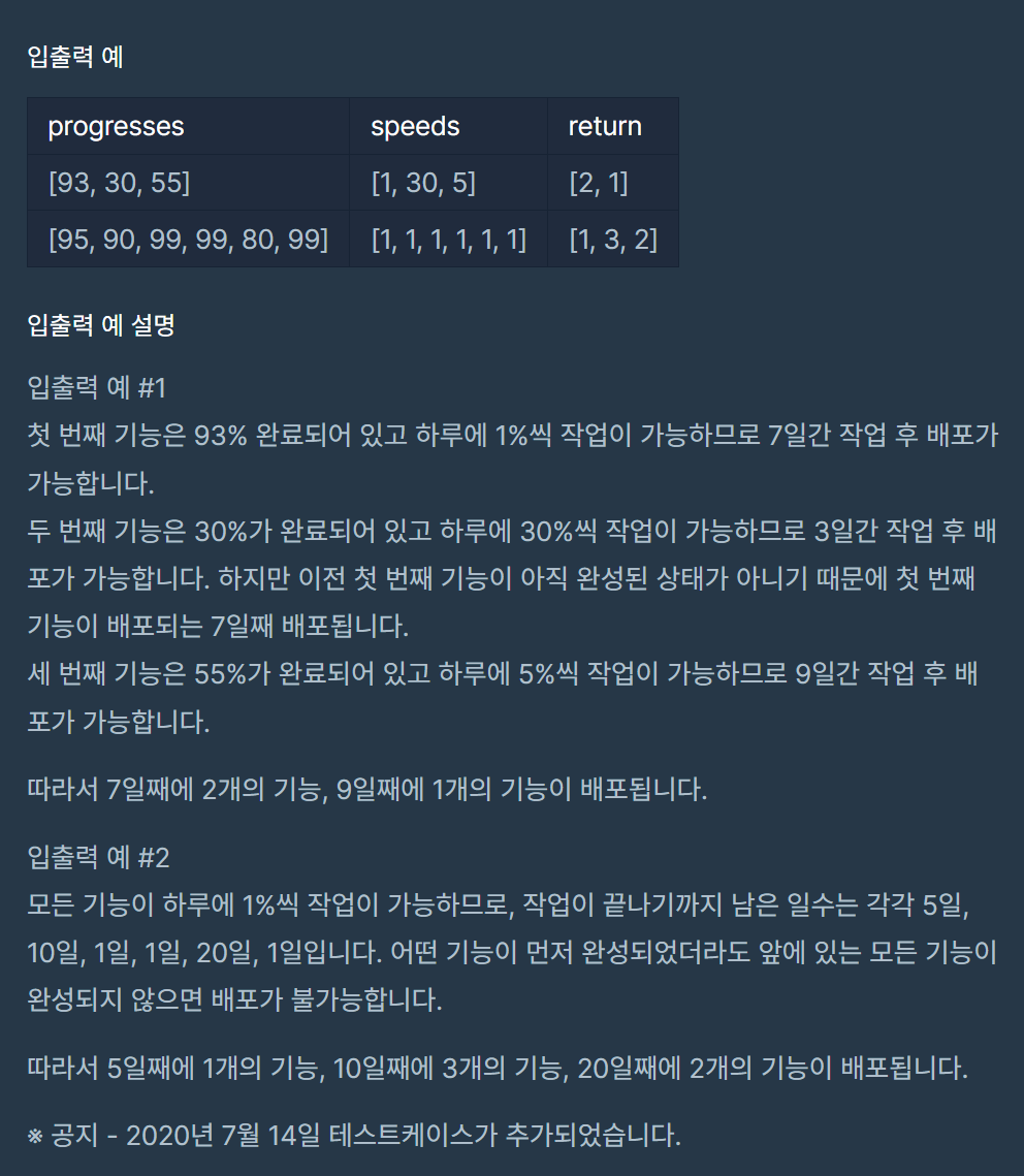 - 남은 일수를 저장할 변수를 생성하고 남은 작업을 계산한 후, 하루 작업 속도를 나눈 몫을 저장한다. times = (100 - progresses[i]) // speeds[i]