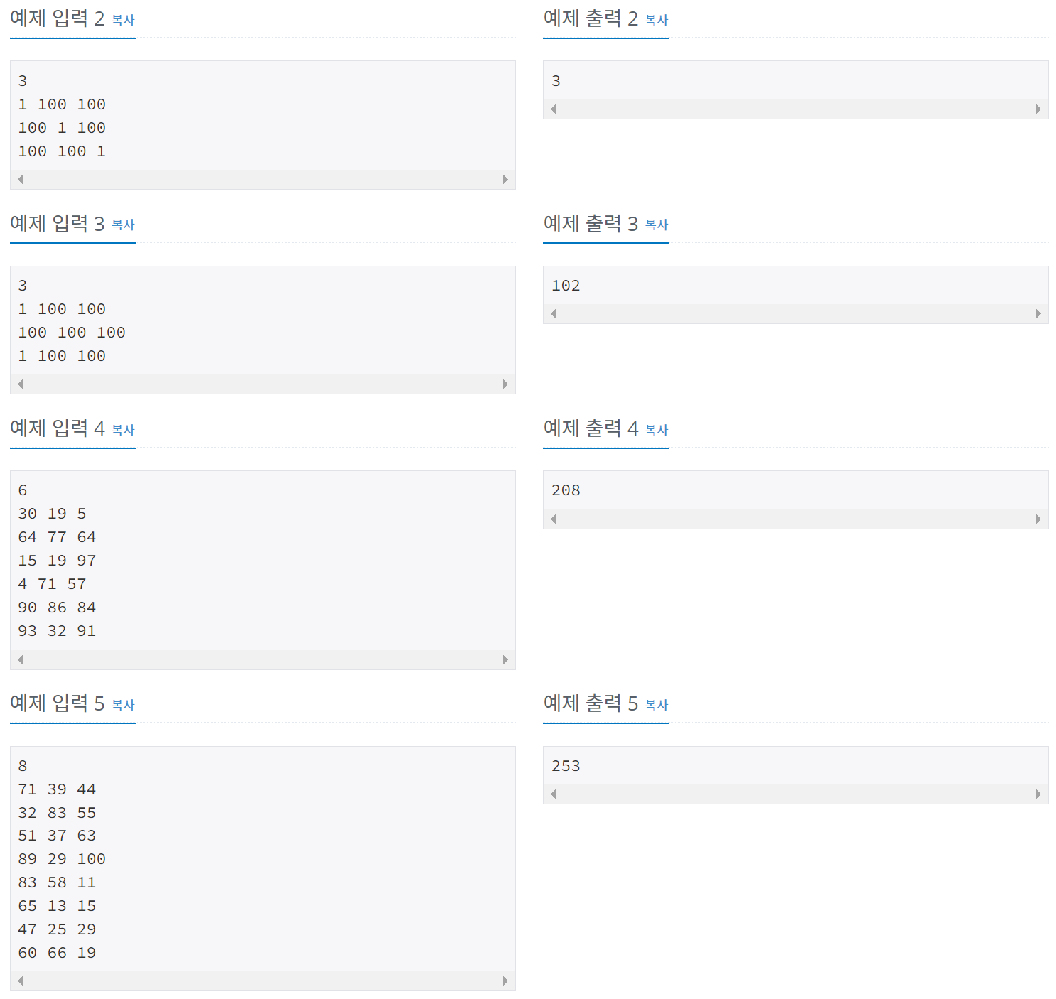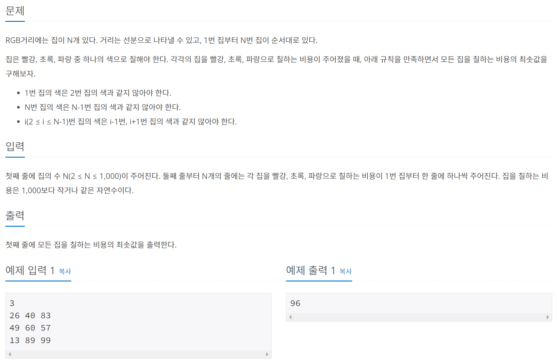 첫째 줄에 집의 수 N(2 ≤ N ≤ 1,000)이 주어진다. 둘째 줄부터 N개의 줄에는 각 집을 빨강, 초록, 파랑으로 칠하는 비용이 1번 집부터 한 줄에 하나씩 주어진다. 집을 칠하는 비용은 1,000보다 작거나