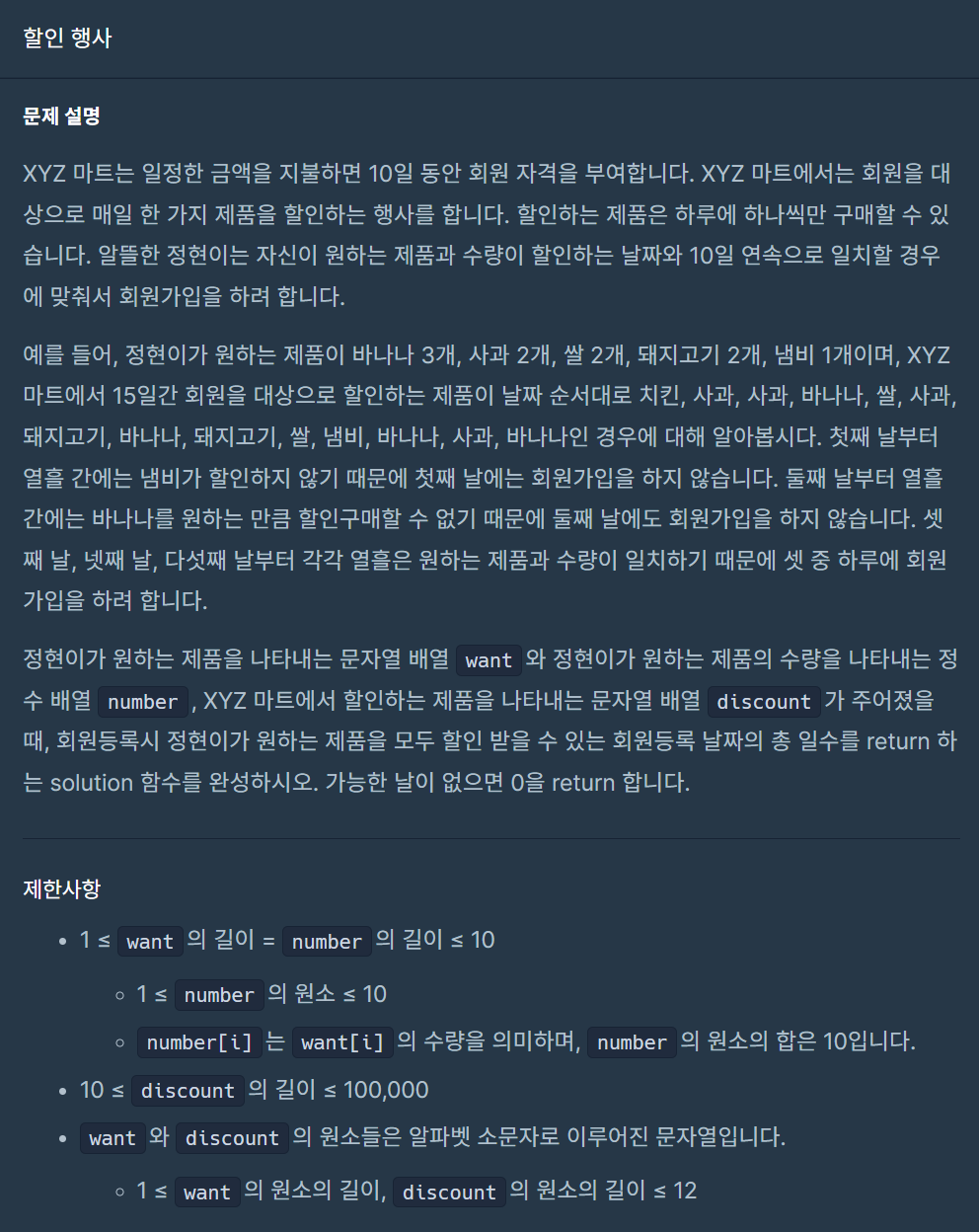 - 각 제품의 개수를 할인하는 제품에서 세어 저장한다. li[j] = discount[i : i + 10].count(want[j])
