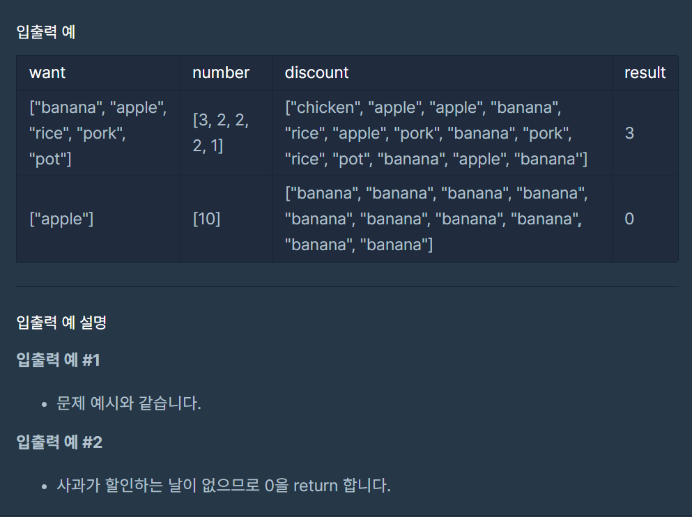 - 각 제품의 개수를 할인하는 제품에서 세어 저장한다. li[j] = discount[i : i + 10].count(want[j])