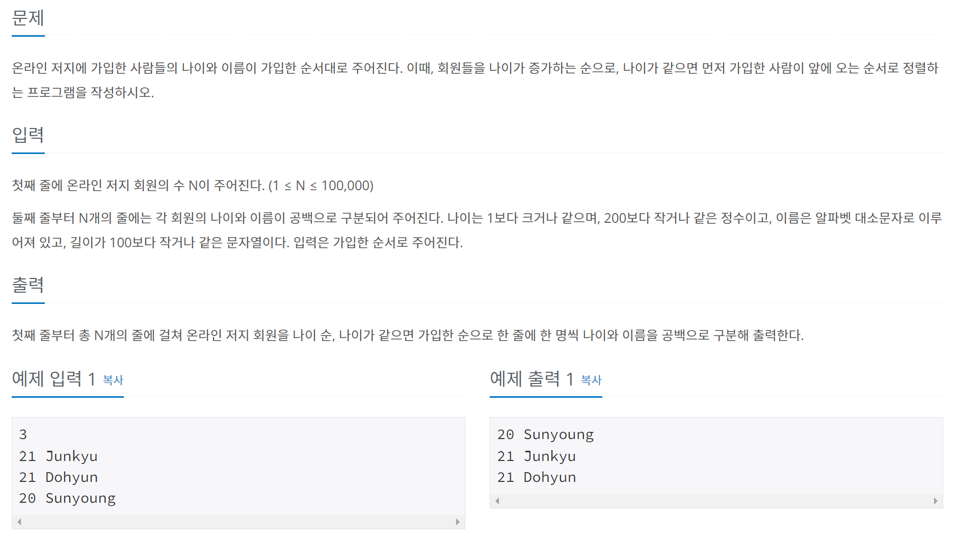 - 나이와 이름을 문자열 형식으로 한 줄로 입력받는다. age, name = map(str, sys.stdin.readline().split())
