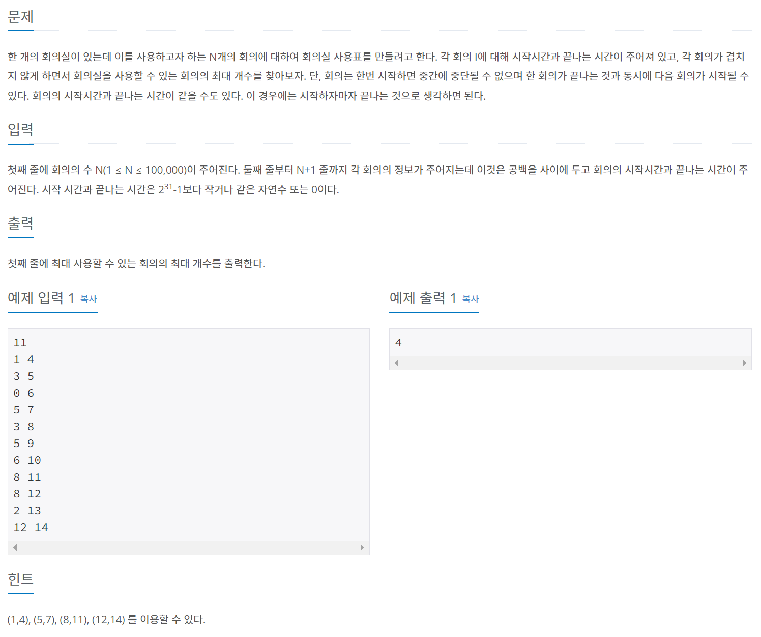 해당 문제는 회의 시간이 겹치면 안 되므로 시작하는 시간과 끝나는 시간이 중요하다.
