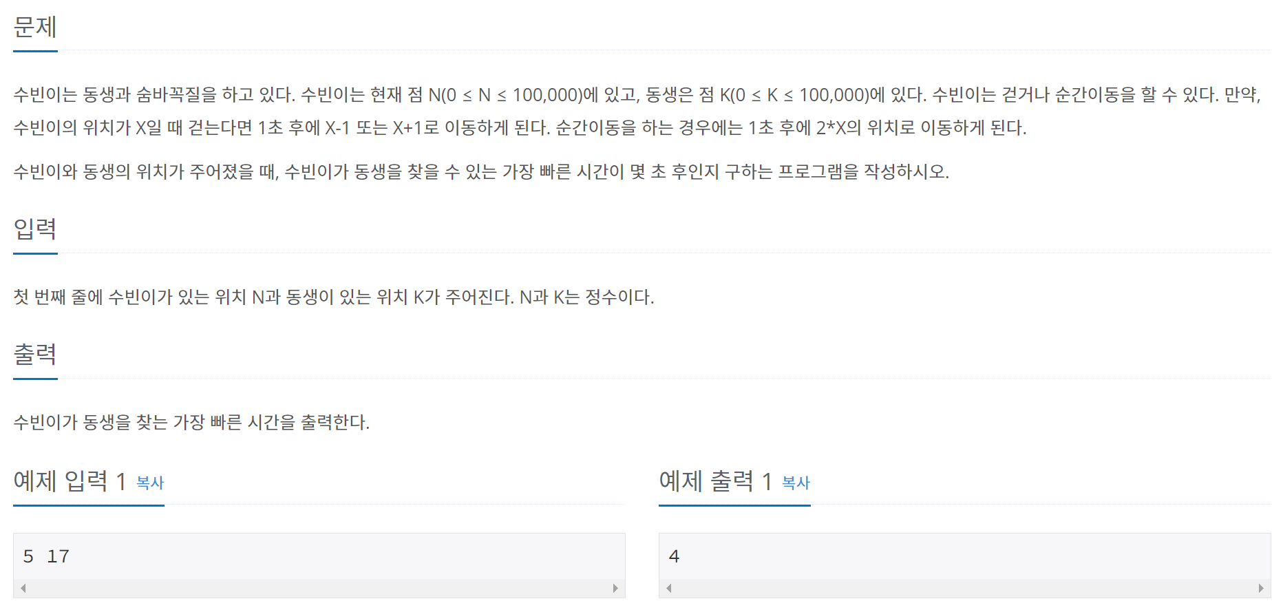 수빈이는 동생과 숨바꼭질을 하고 있다. 수빈이는 현재 점 N(0 ≤ N ≤ 100,000)에 있고, 동생은 점 K(0 ≤ K ≤ 100,000)에 있다. 수빈이는 걷거나 순간이동을 할 수 있다. 만약, 수빈이의 위치가 X일