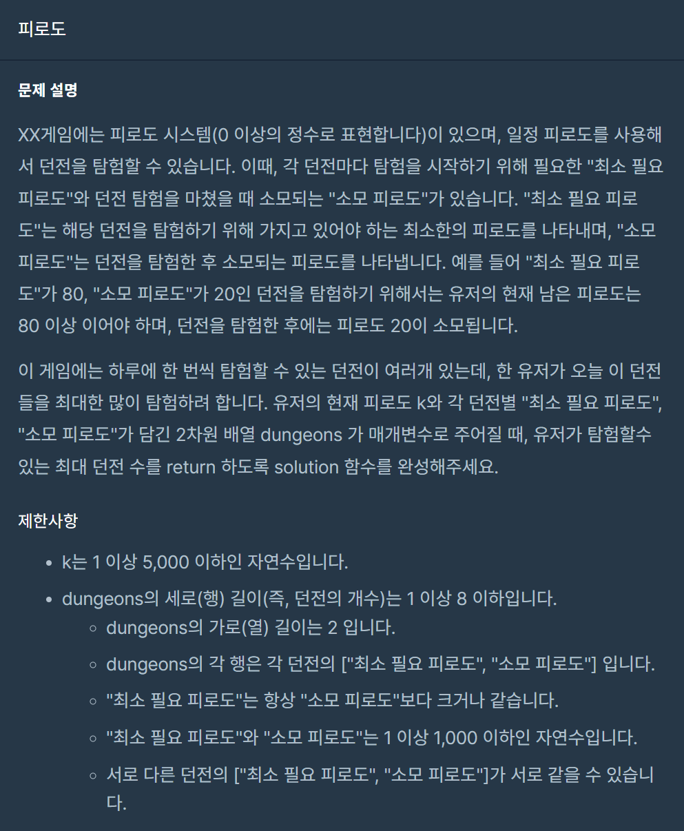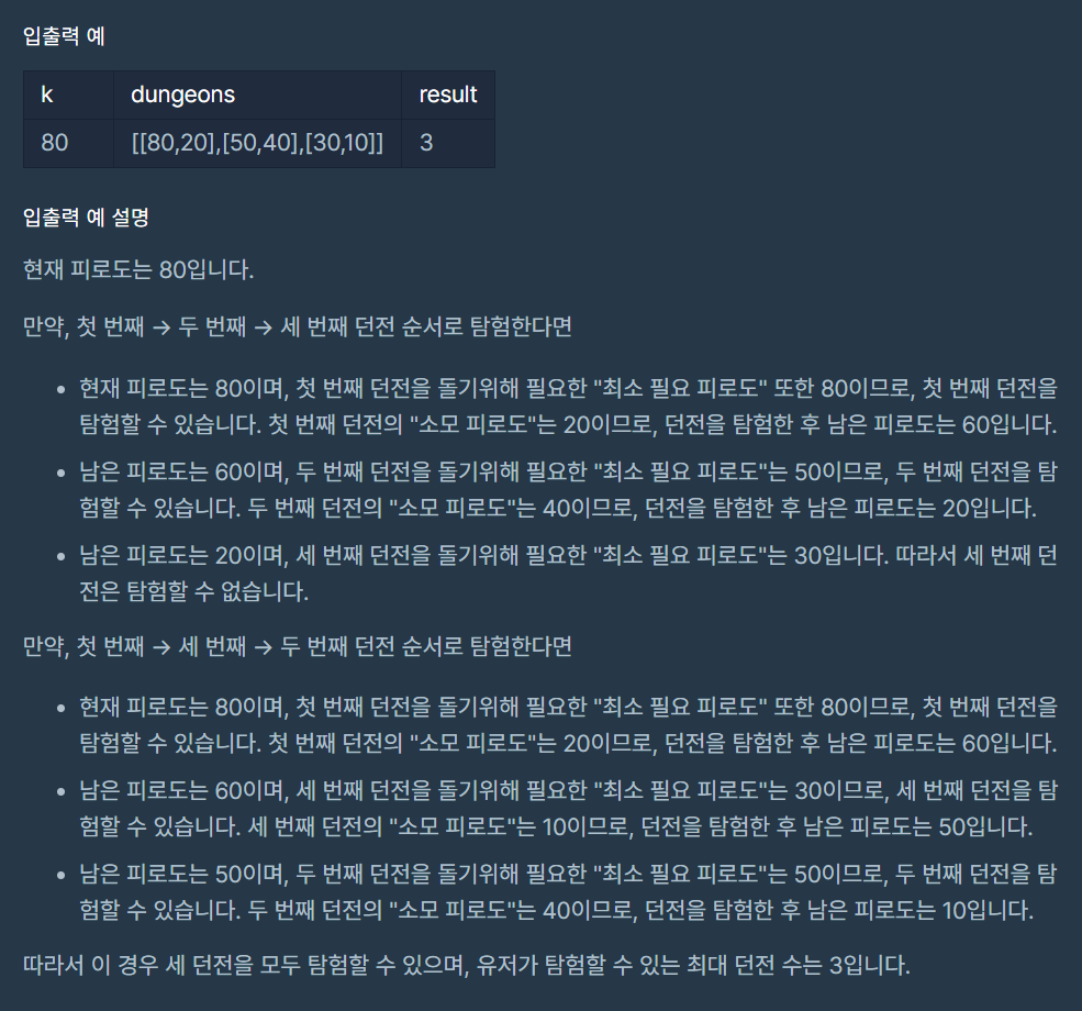 해당 문제의 던전의 최대 개수는 8개로 그렇게 많지가 않다. 하여 입력받은 던전에서 가능한 모든 순열의 결과를 구하고 이를 하나씩 불러오며 탐험 가능한 던전의 개수를 구한다.