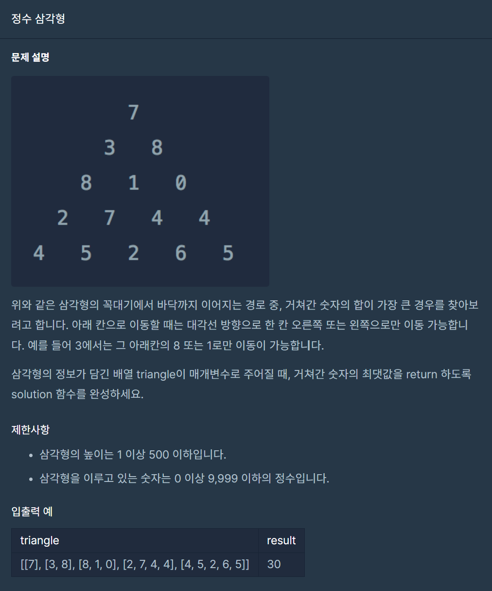- 제일 처음 출발점의 값을 추가한다. result.append(triangle[0])