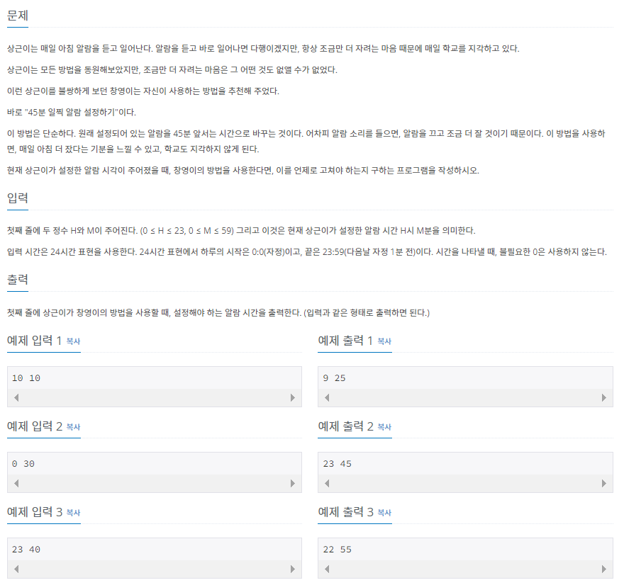 - 입력받는 분의 값이 45보다 작을 경우 시의 값이 중요하다. else