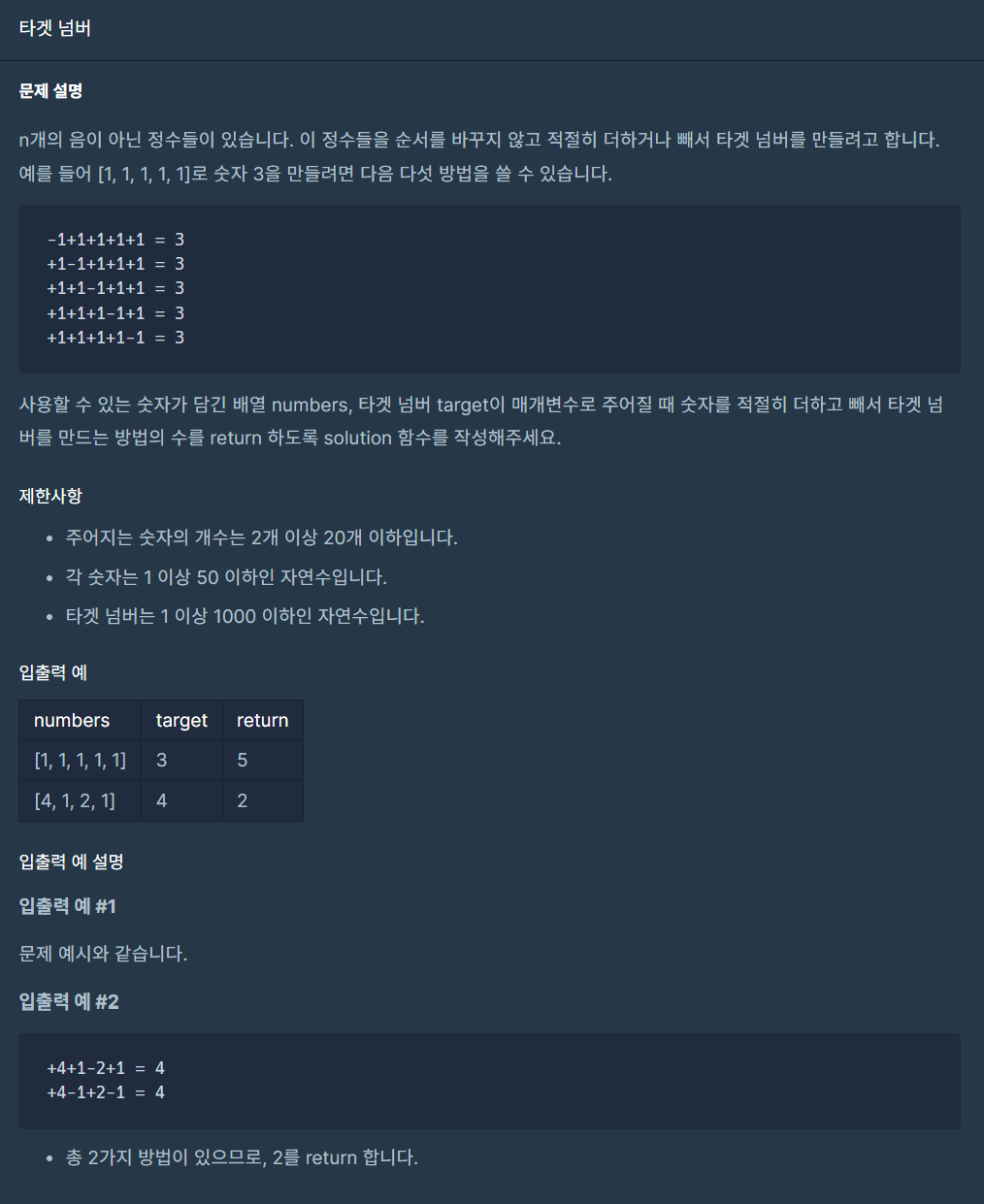 하여 모든 경우의 수를 구하고 이를 하나씩 확인하여 각 수의 합을 구한 뒤, 해당 합이 타겟 넘버와 같은지 비교하는 방식으로 문제를 해결하였다.