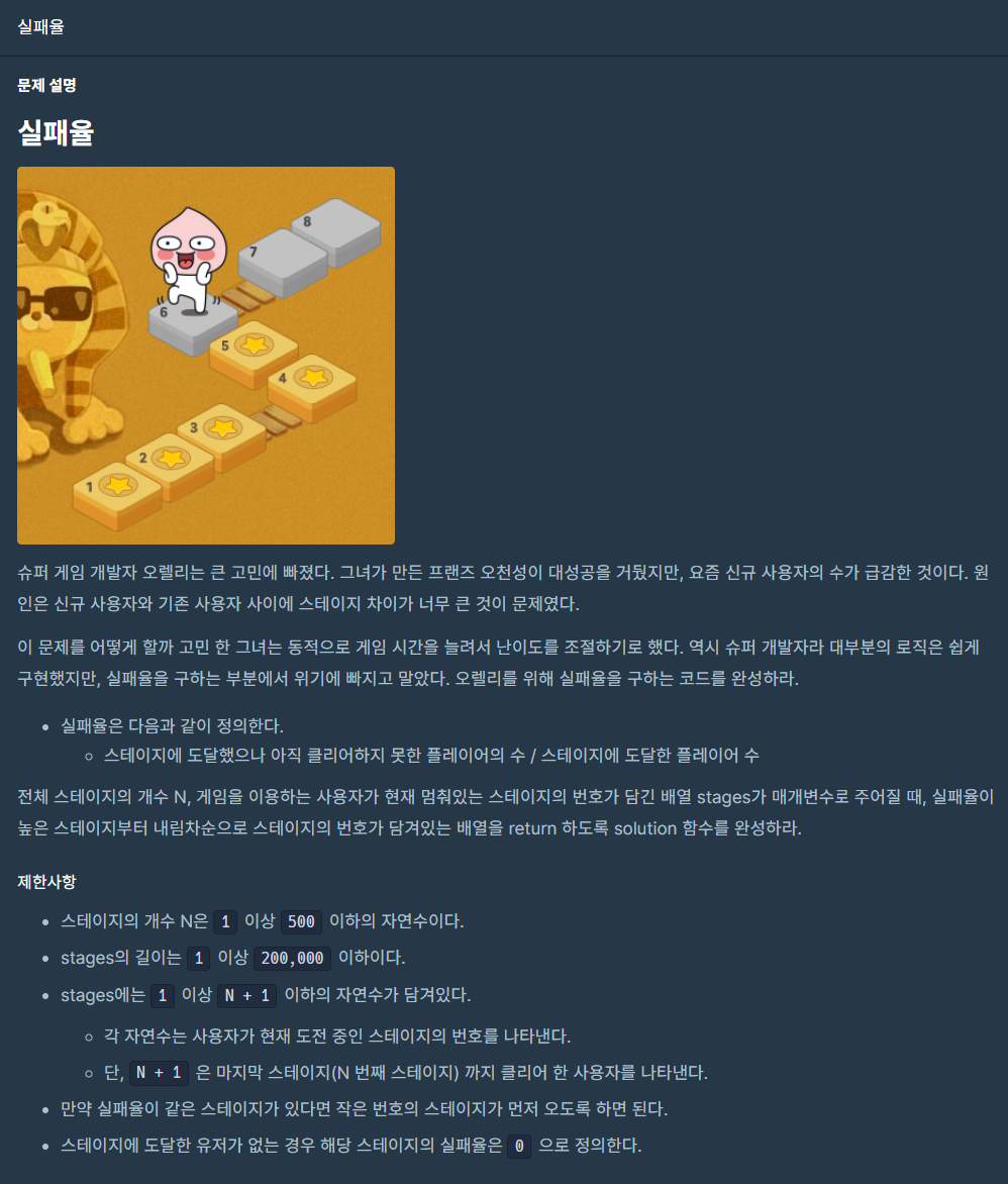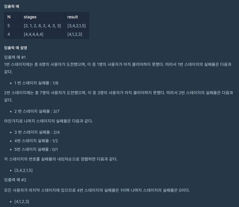 해당 문제는 각 스테이지 별로 실패하는 사람의 수를 세어 현재 스테이지 별 남은 사람의 수를 나눠주면 실패율을 구할 수 있다. 구한 실패율을 각각 저장하고 실패율을 기준으로 내림차순으로 정렬하여 해당 스테이지 번호를 출력하면 된다.