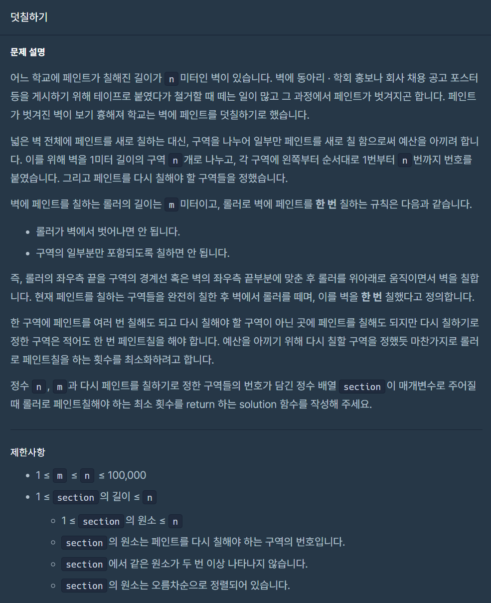 - 그리고 칠해야 하는 구역의 시작부터 롤러의 길이만큼 한 번에 칠해야 하므로 칠해지는 구역을 하나씩 추출하여 벽을 칠하는데 for j in range(i - 1, i + m - 1)