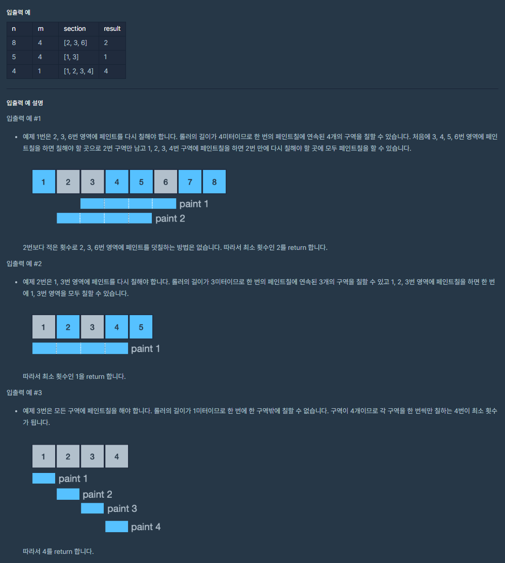 - 그리고 칠해야 하는 구역의 시작부터 롤러의 길이만큼 한 번에 칠해야 하므로 칠해지는 구역을 하나씩 추출하여 벽을 칠하는데 for j in range(i - 1, i + m - 1)