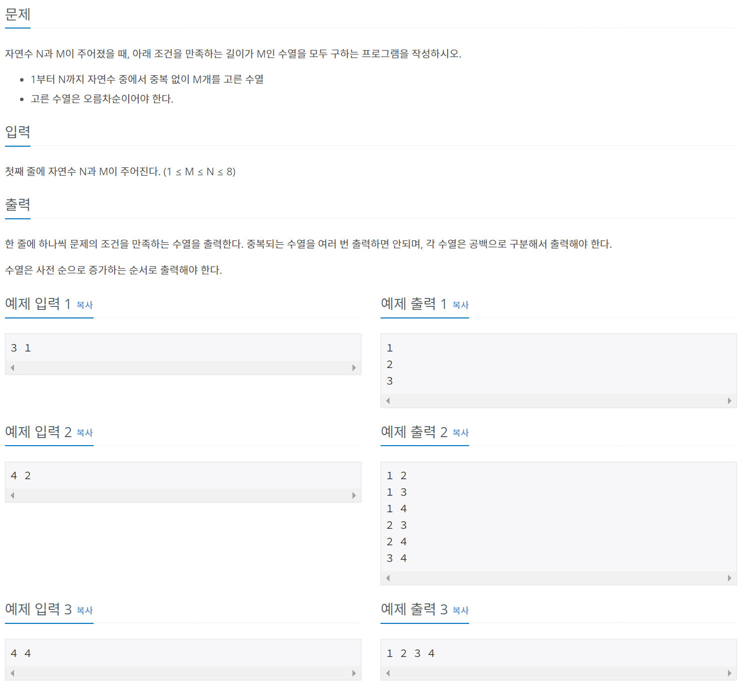 한 줄에 하나씩 문제의 조건을 만족하는 수열을 출력한다. 중복되는 수열을 여러 번 출력하면 안되며, 각 수열은 공백으로 구분해서 출력해야 한다. 수열은 사전 순으로 증가하는 순서로 출력해