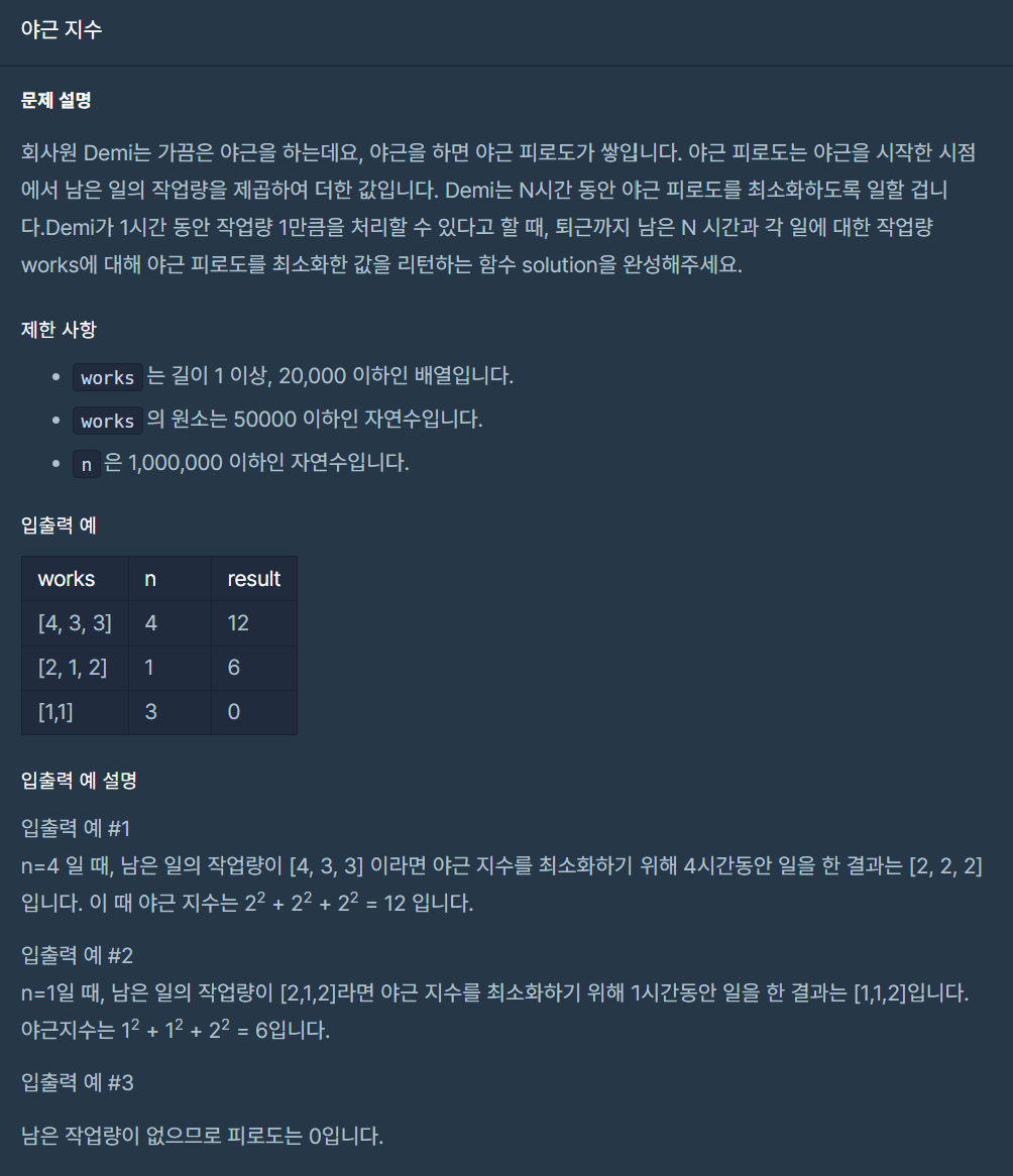 - 퇴근시간이 다 되었으면 남은 작업의 양을 하나씩 추출하여 야근 지수를 계산한다. for i in works: answer += i ** 2