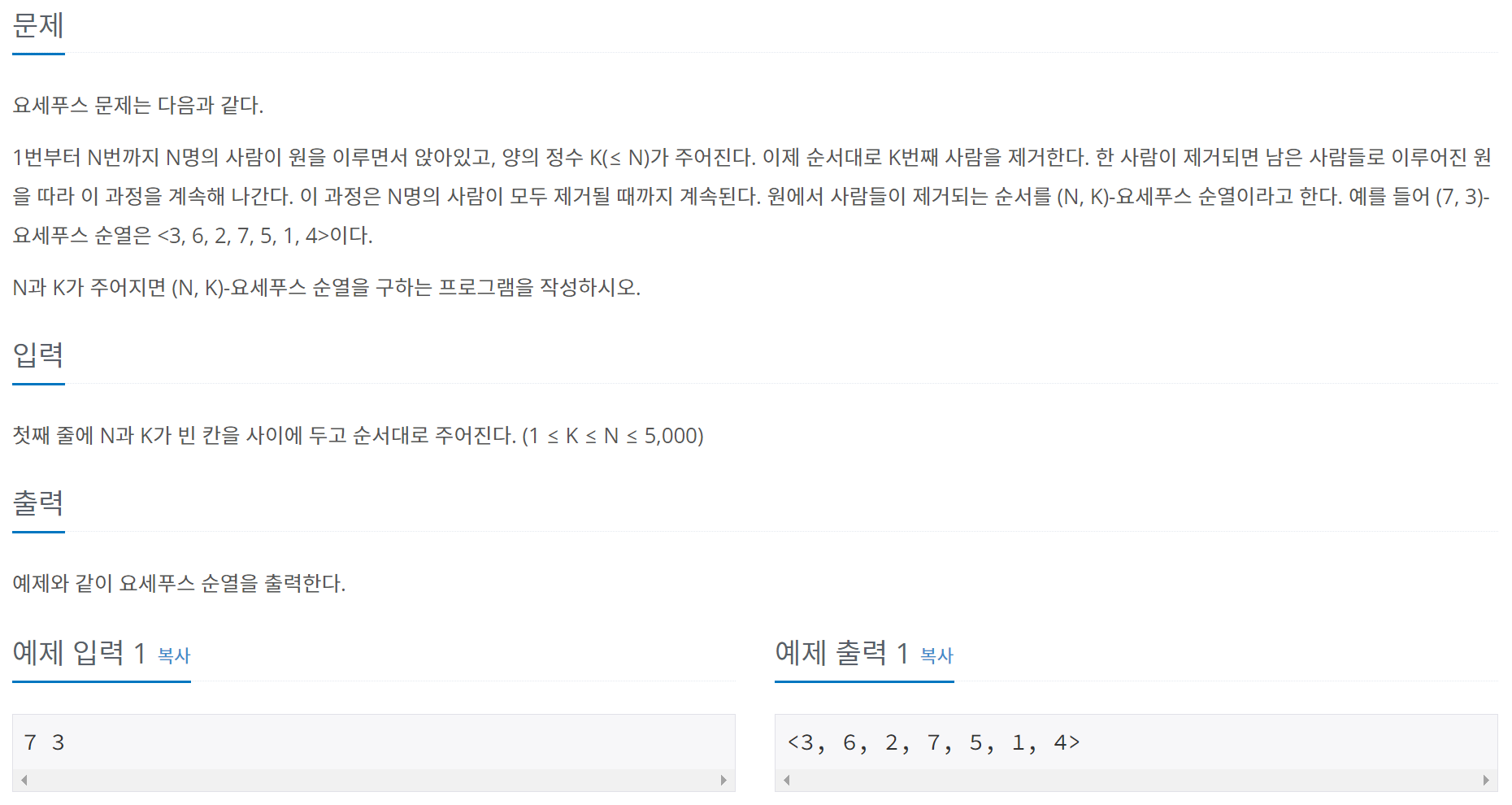 - 인원 수와 제거할 위치를 입력받는다. N, K = map(int, sys.stdin.readline().split())
