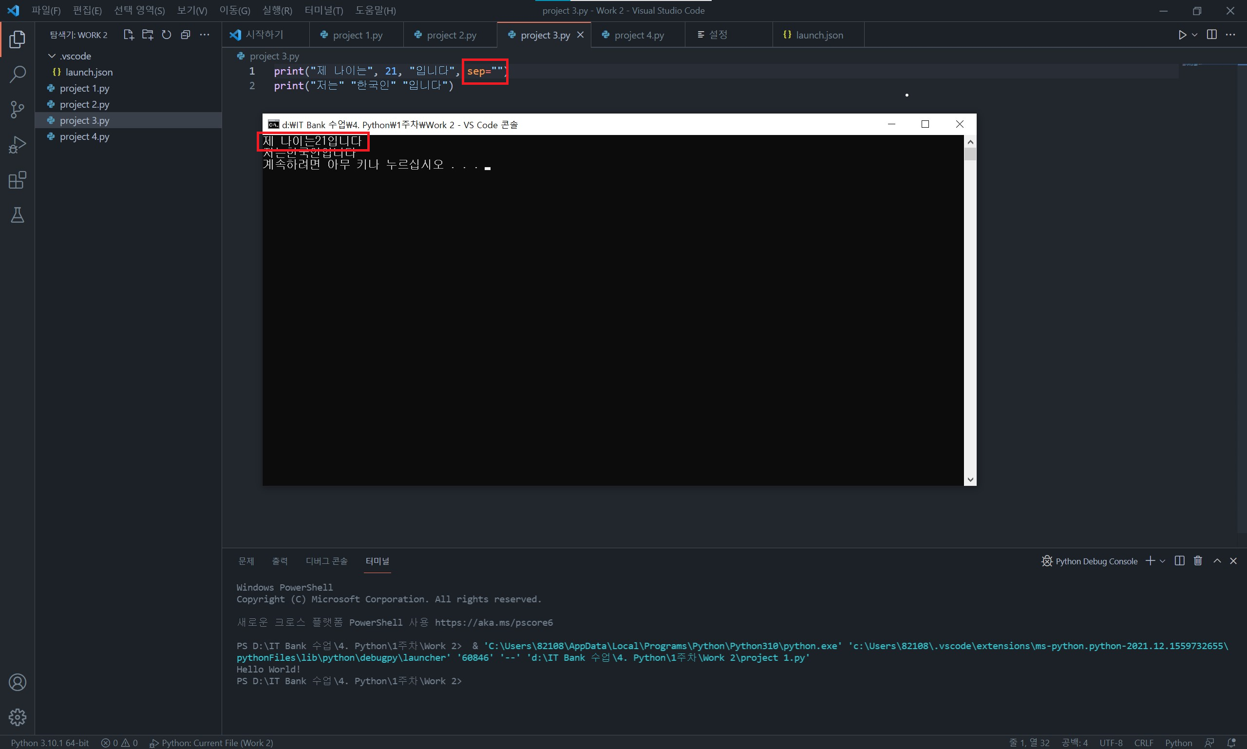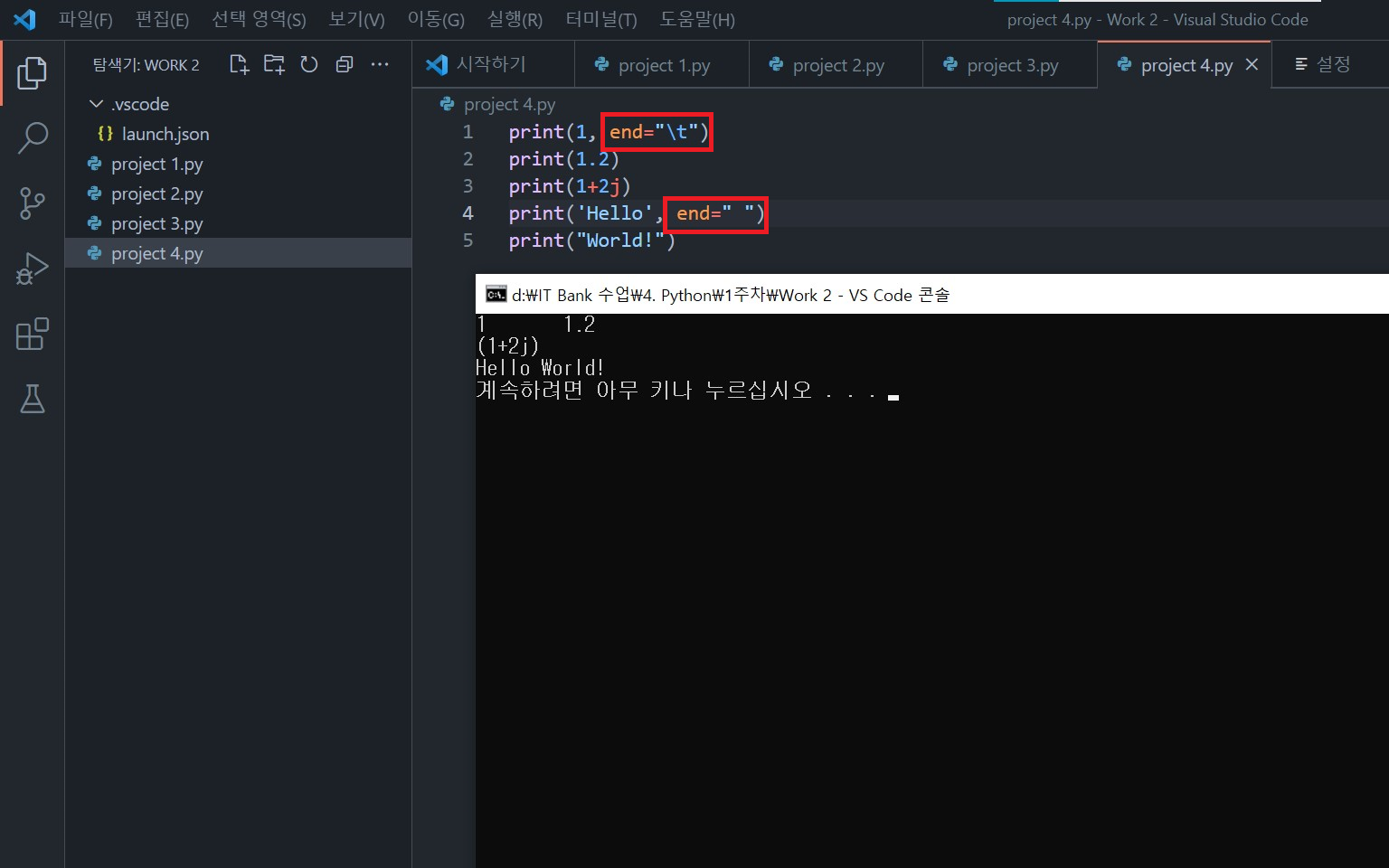 또한 sep="" 는 다른 형태의 자료형을 이어서 출력할 때 사이 공백을 제거해 주는 역할을 합니다.