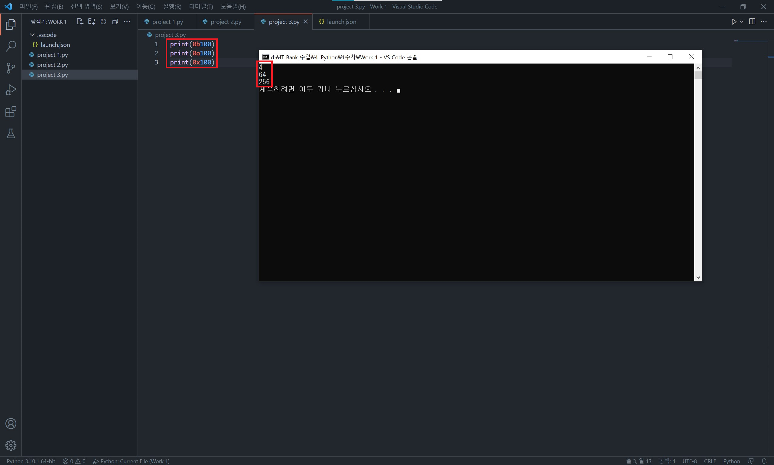 0b를 붙이면 이진법으로, 0o을 붙이면 8진법으로, 0x를 붙이면 16진법으로 출력됩니다.